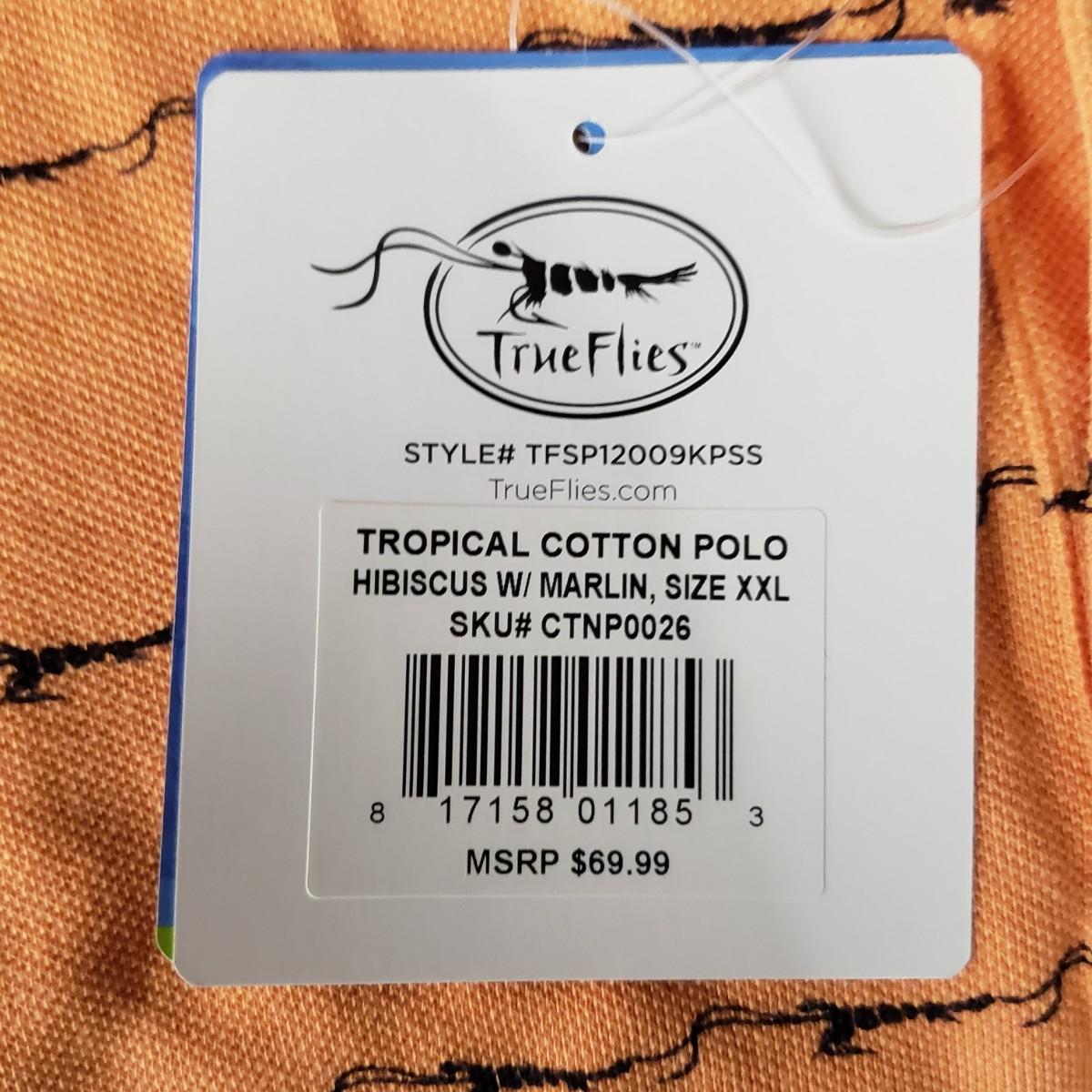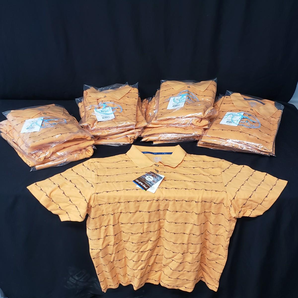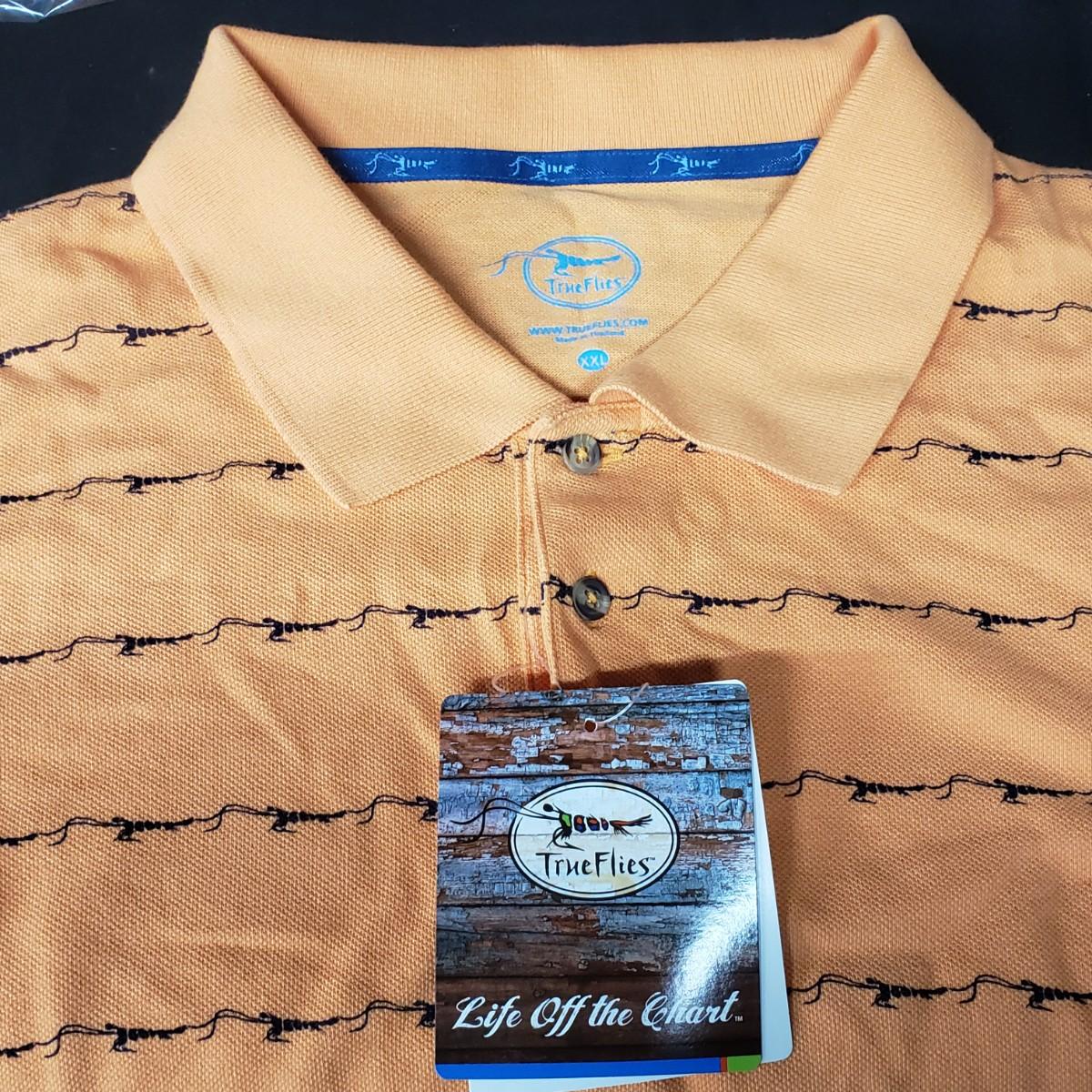 6 XXL, 12XL, 6L True Flies brand orange cotton polo shirts, new in the bag. The brand shrimp logo in black stripes. Shipping available.