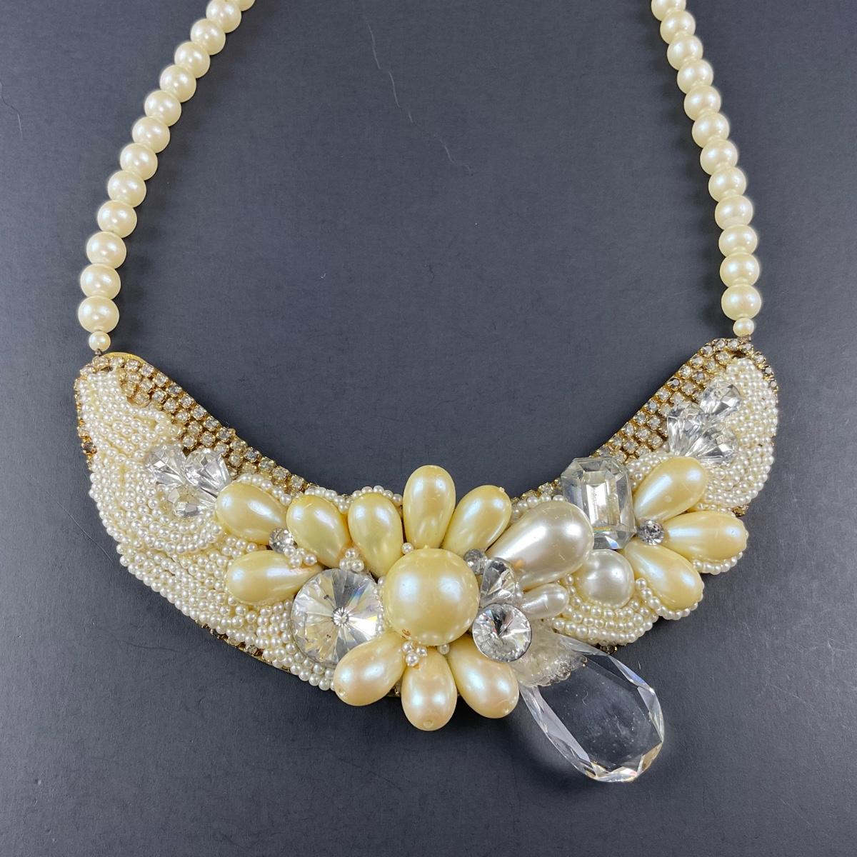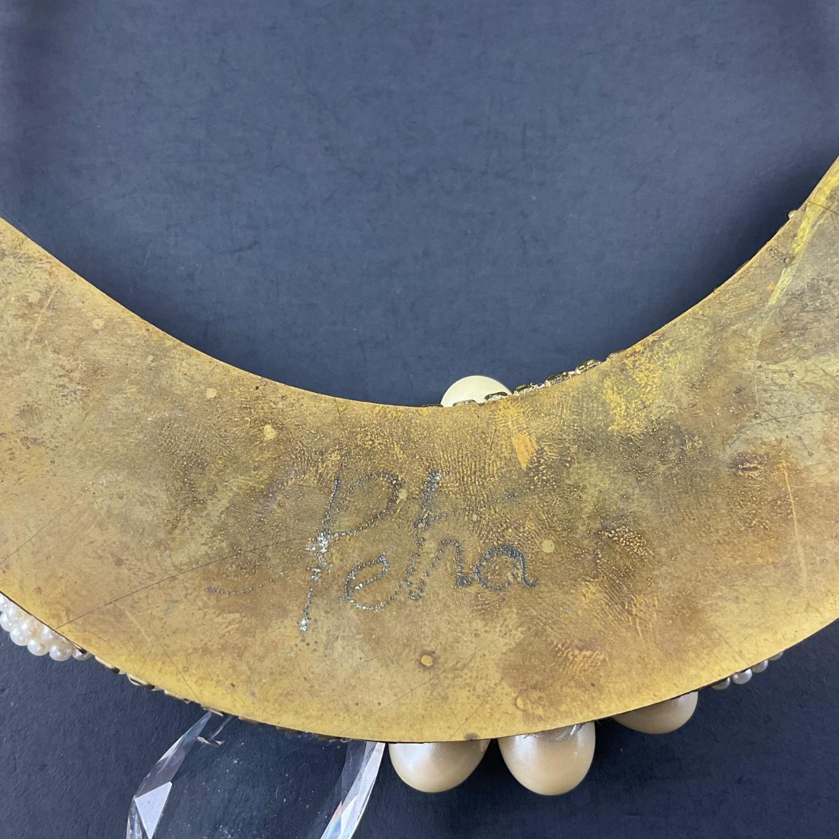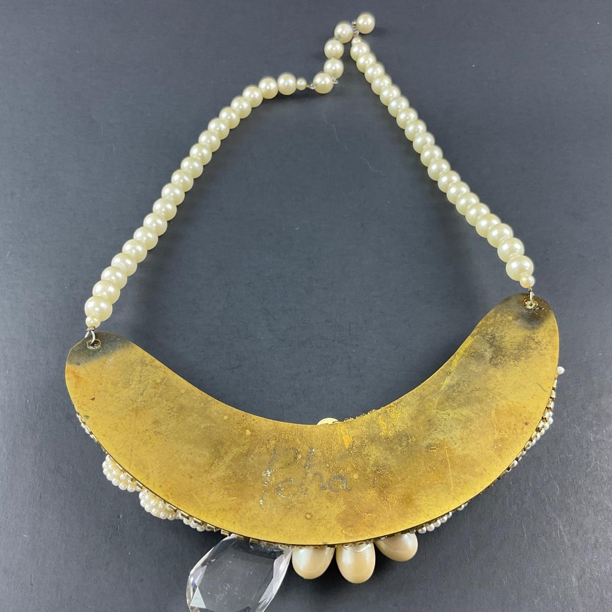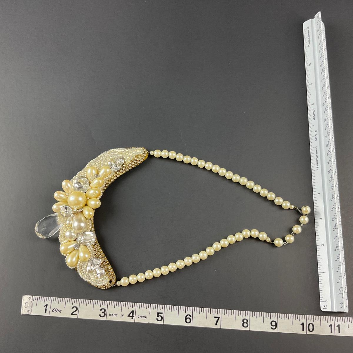 One handmade artisan beaded and believed to be faux pearl necklace collar, with brass backing and signed Petra on the back. This piece does have some scuffs, scratches, marks, or slight damage, but otherwise appears to be in great shape. Please see photos for details and condition. Any condition statement is given as a courtesy to a client, is an opinion, and should not be treated as a statement of fact. Reference to condition written, oral or within a condition report shall not be regarded as a full account of condition and may not include all defects, alterations, or restorations. Absence of a condition report does not imply a lot is flawless or lacking imperfections or damage. Katherine’s Auction & Appraisal Service shall have no responsibility for any error or omission. Returns shall not be accepted on the basis of condition. ::: Shipping is available on this lot. If you require shipping you must let us know at the close of the auction. We will coordinate with you after the item has been won. Shipping fees will include insurance up to or exceeding the value of all items being mailed. If you have any questions regarding this lot please contact the auctioneer either via this website, by direct email or by phone. PICK UP TIMES and other important information can be found in the TERMS and DESCRIPTION of the auction. Please take a look for pertinent information. Thanks!
