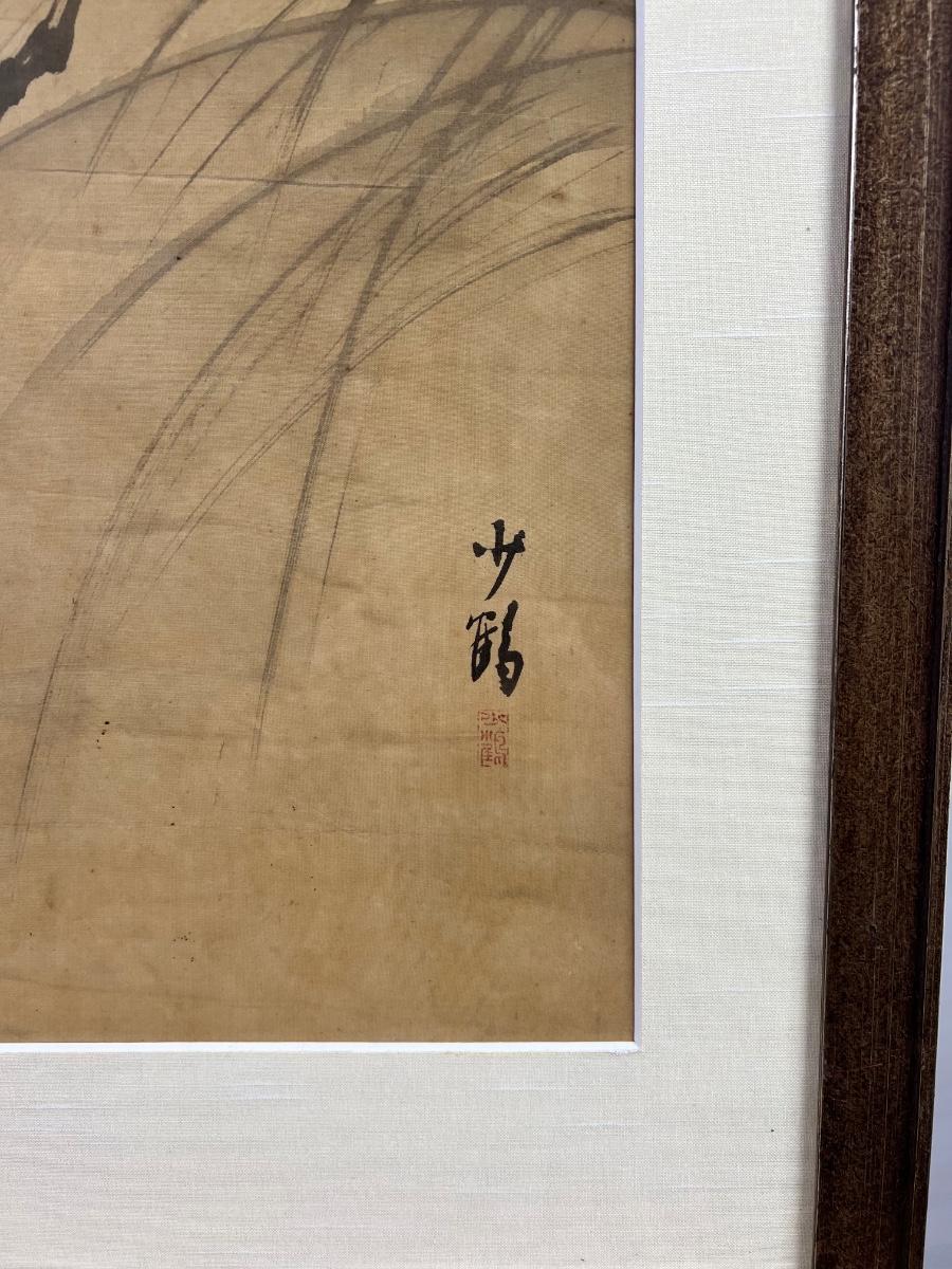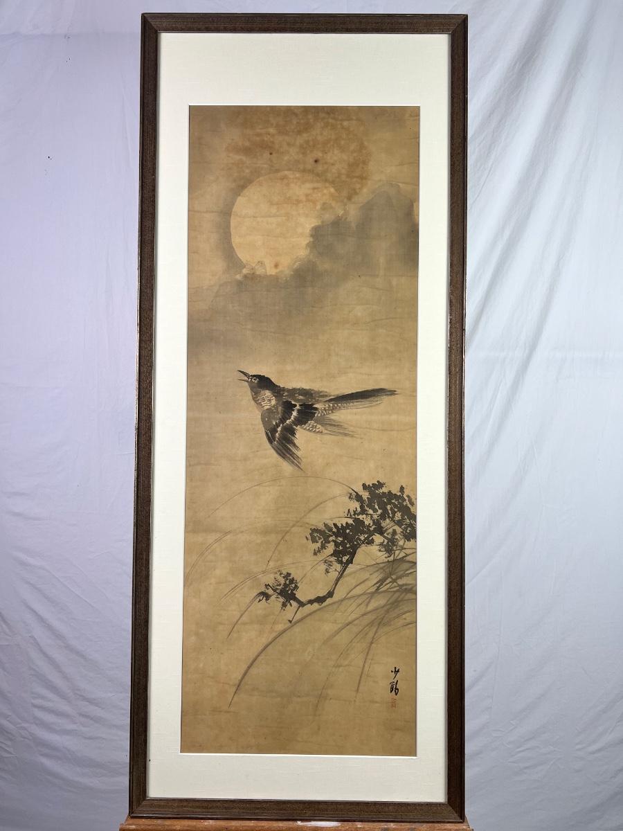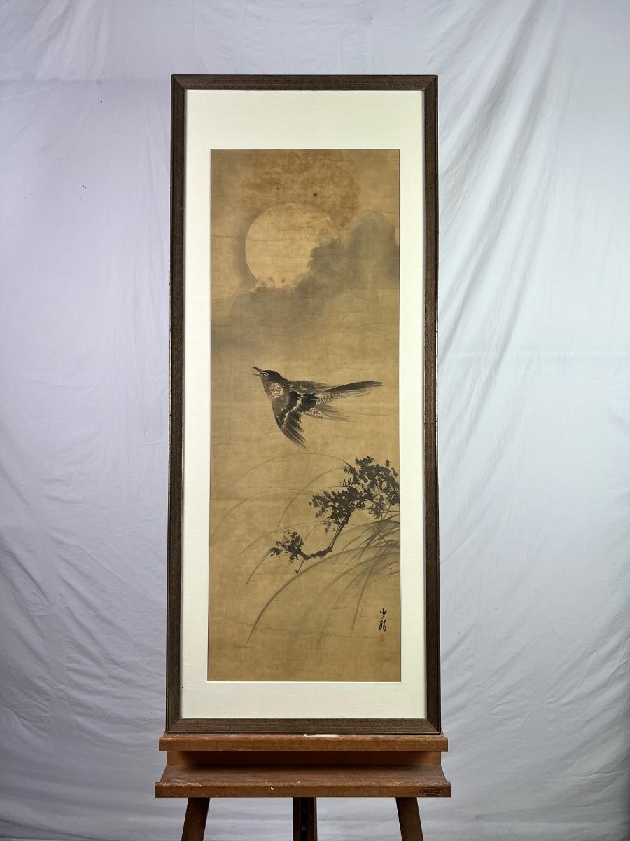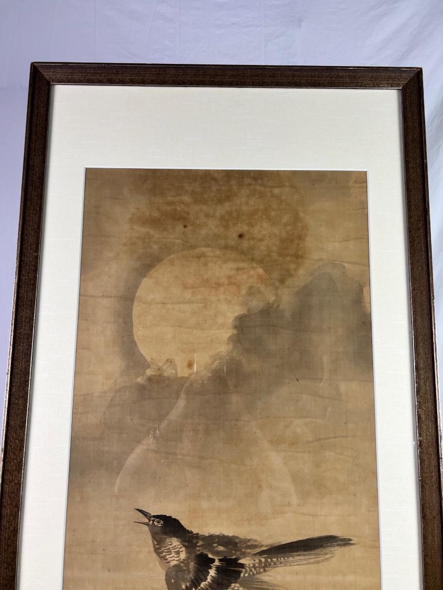 Framed, single matted silk of bird in flight. There is some Foxing (Discoloration ) on the top of the silk shown in photo.