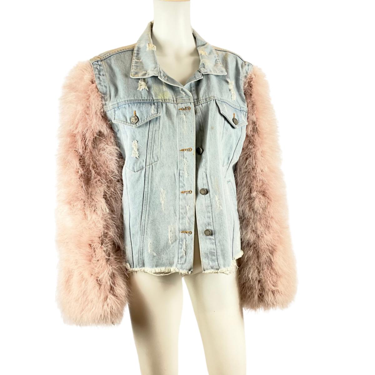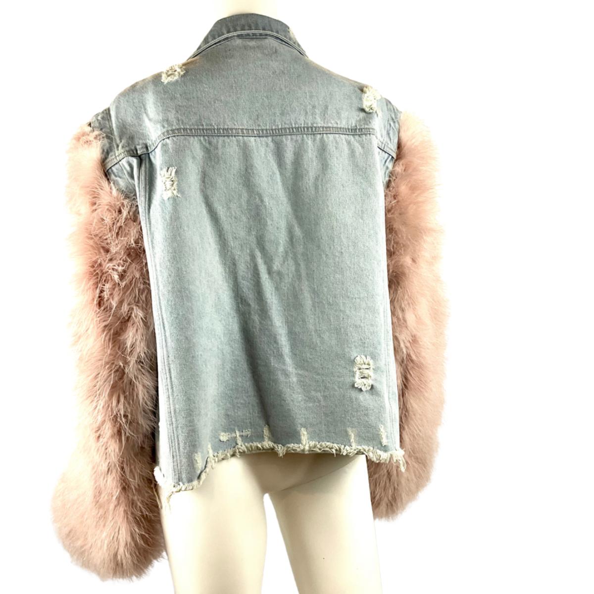 Trendy Joyce denim jacket featuring a unique twist with detachable feathered sleeves. This versatile piece allows you to transition seamlessly from a bold, statement look to a classic denim jacket style.
