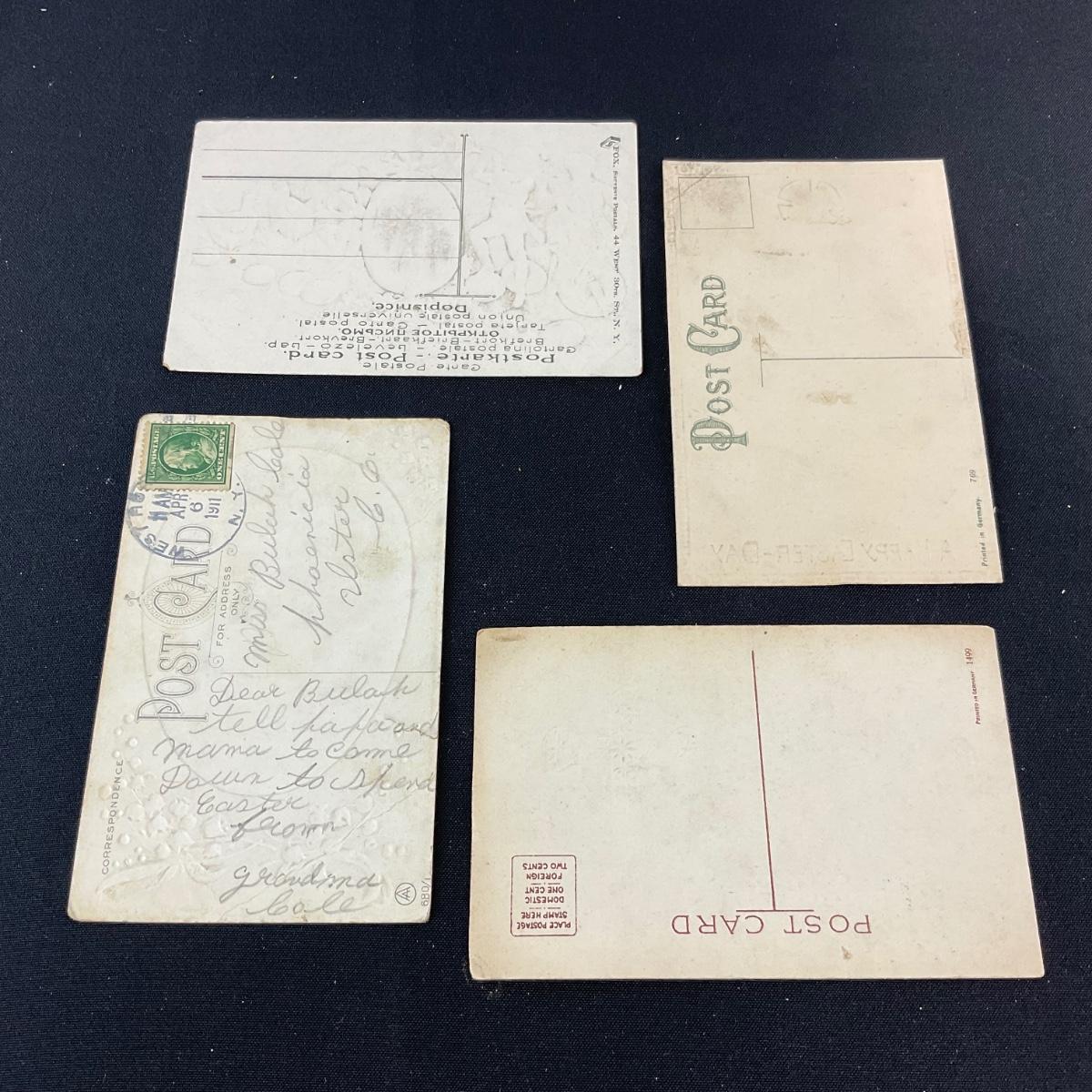 Four assorted Easter postcards. Please see photos for details and condition. Any condition statement is given as a courtesy to a client, is an opinion, and should not be treated as a statement of fact. Reference to condition written, oral or within a condition report shall not be regarded as a full account of condition and may not include all defects, alterations, or restorations. Absence of a condition report does not imply a lot is flawless or lacking imperfections or damage. Katherine’s Auction & Appraisal Service shall have no responsibility for any error or omission. Returns shall not be accepted on the basis of condition. ::: Shipping is available on this lot. If you require shipping you must let us know at the close of the auction. We will coordinate with you after the item has been won. Shipping fees will include insurance up to or exceeding the value of all items being mailed. If you have any questions regarding this lot please contact the auctioneer either via this website, by direct email or by phone. PICK UP TIMES and other important information can be found in the TERMS and DESCRIPTION of the auction. Please take a look for pertinent information. Thanks!