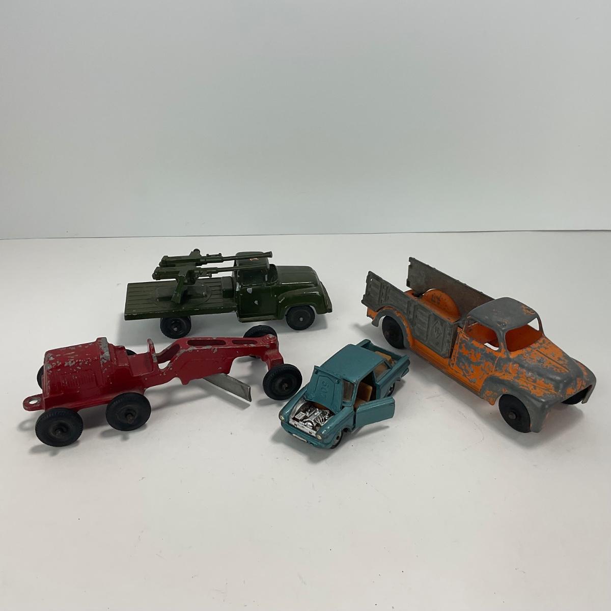 Four vintage toy vehicles in well loved condition. Please see photos for details and condition. ::: Shipping is available on this lot. If you require shipping you must let us know at the close of the auction. We will coordinate with you after the item has been won. Shipping fees will include insurance up to or exceeding the value of all items being mailed. If you have any questions regarding this lot please contact the auctioneer either via this website, by direct email or by phone. PICK UP TIMES and other important information can be found in the TERMS and DESCRIPTION of the auction. Please take a look for pertinent information. Thanks!