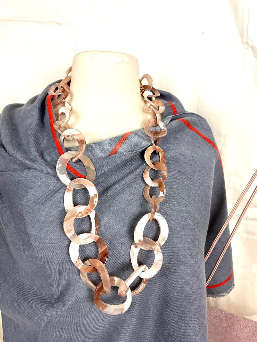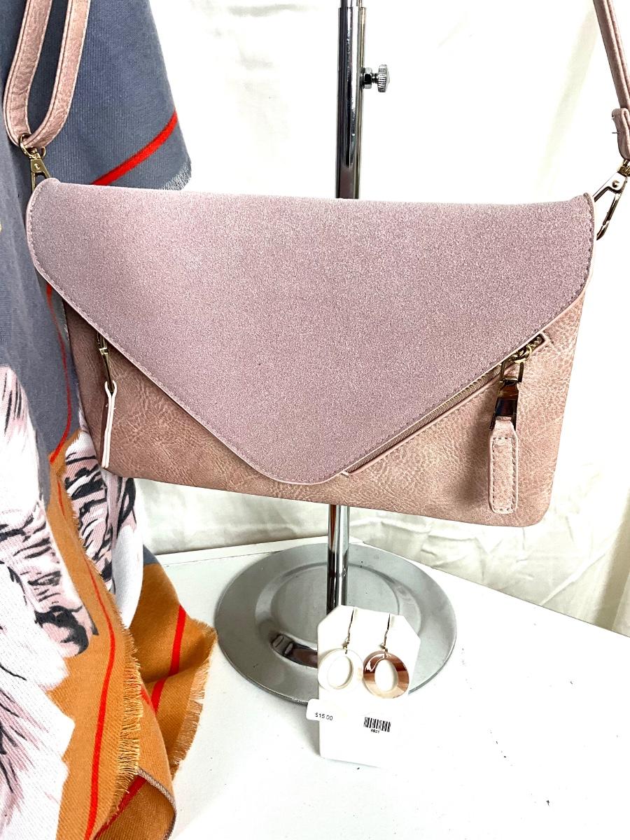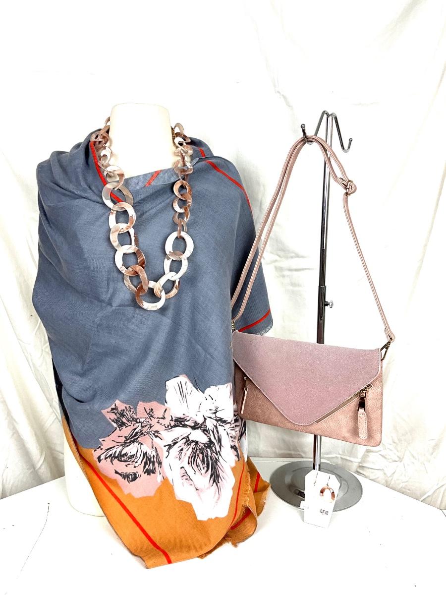 241 Pink and Grey Floral Shawl with Shell Link Necklace and Earrings, Pink Handbag