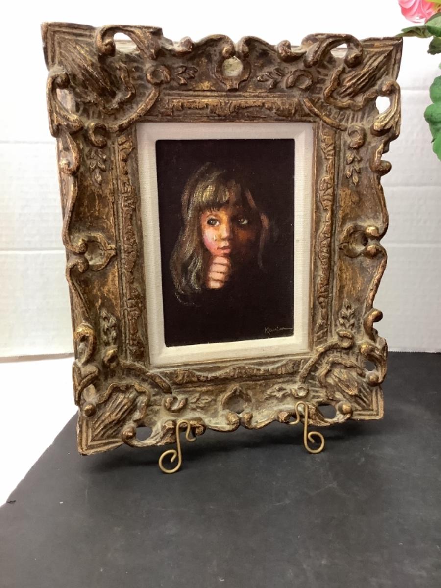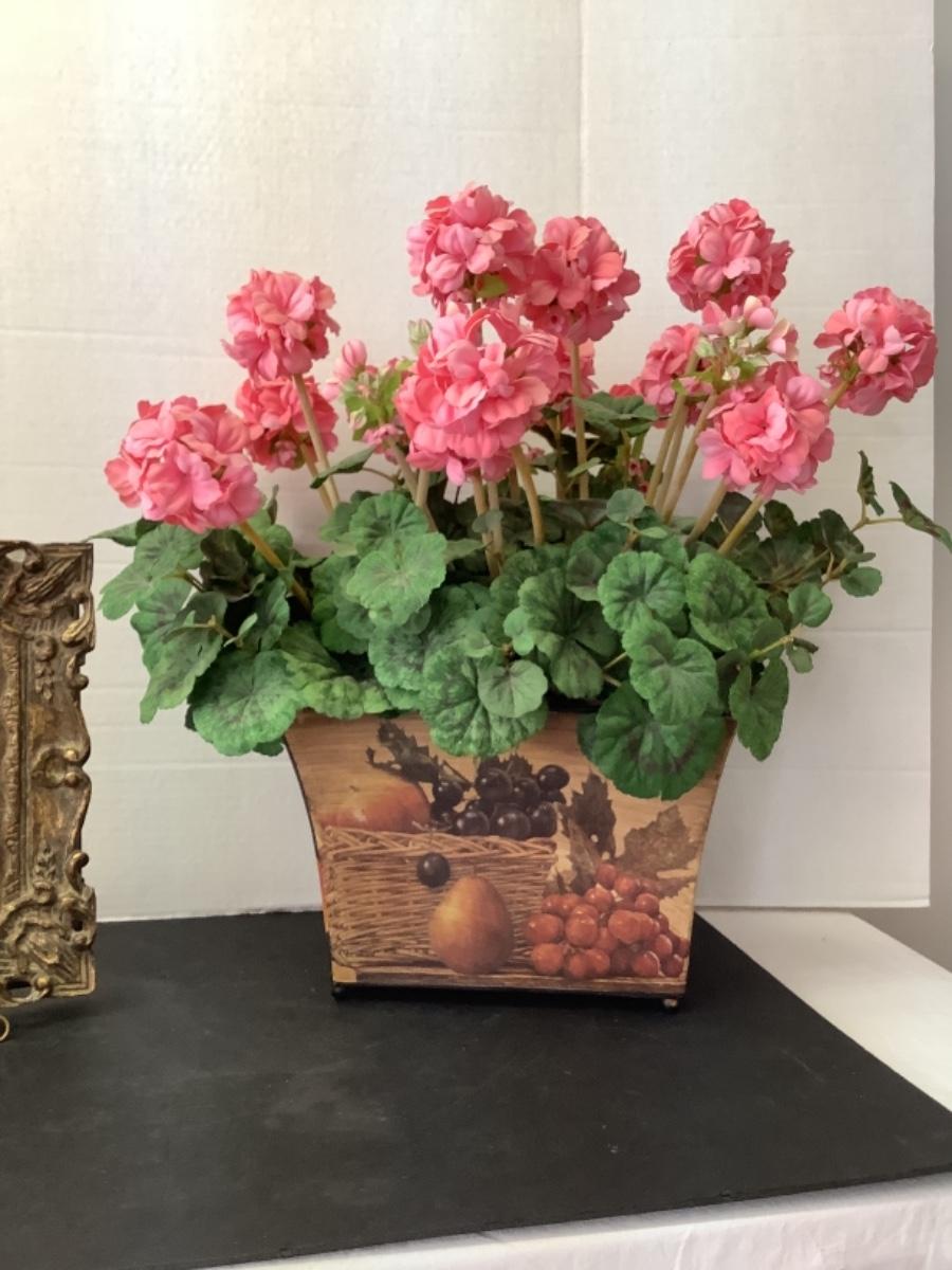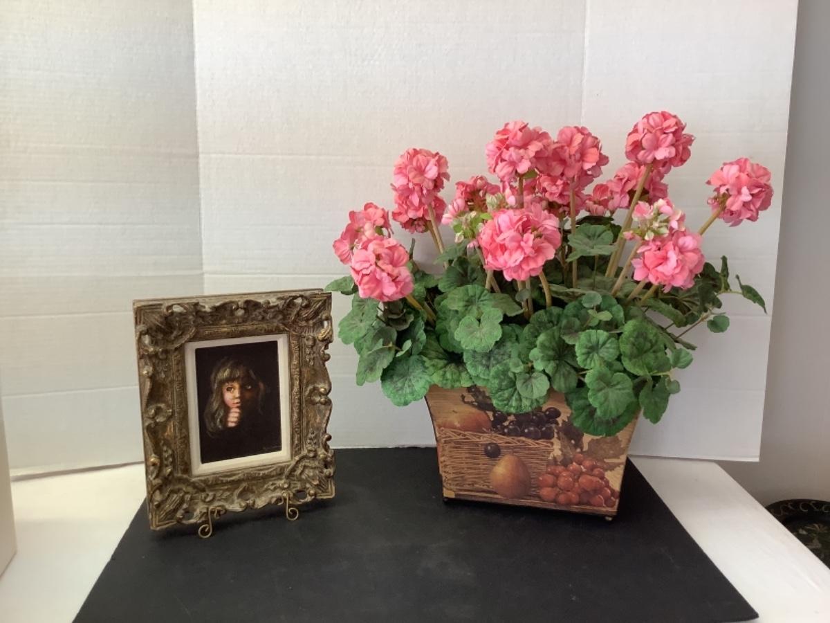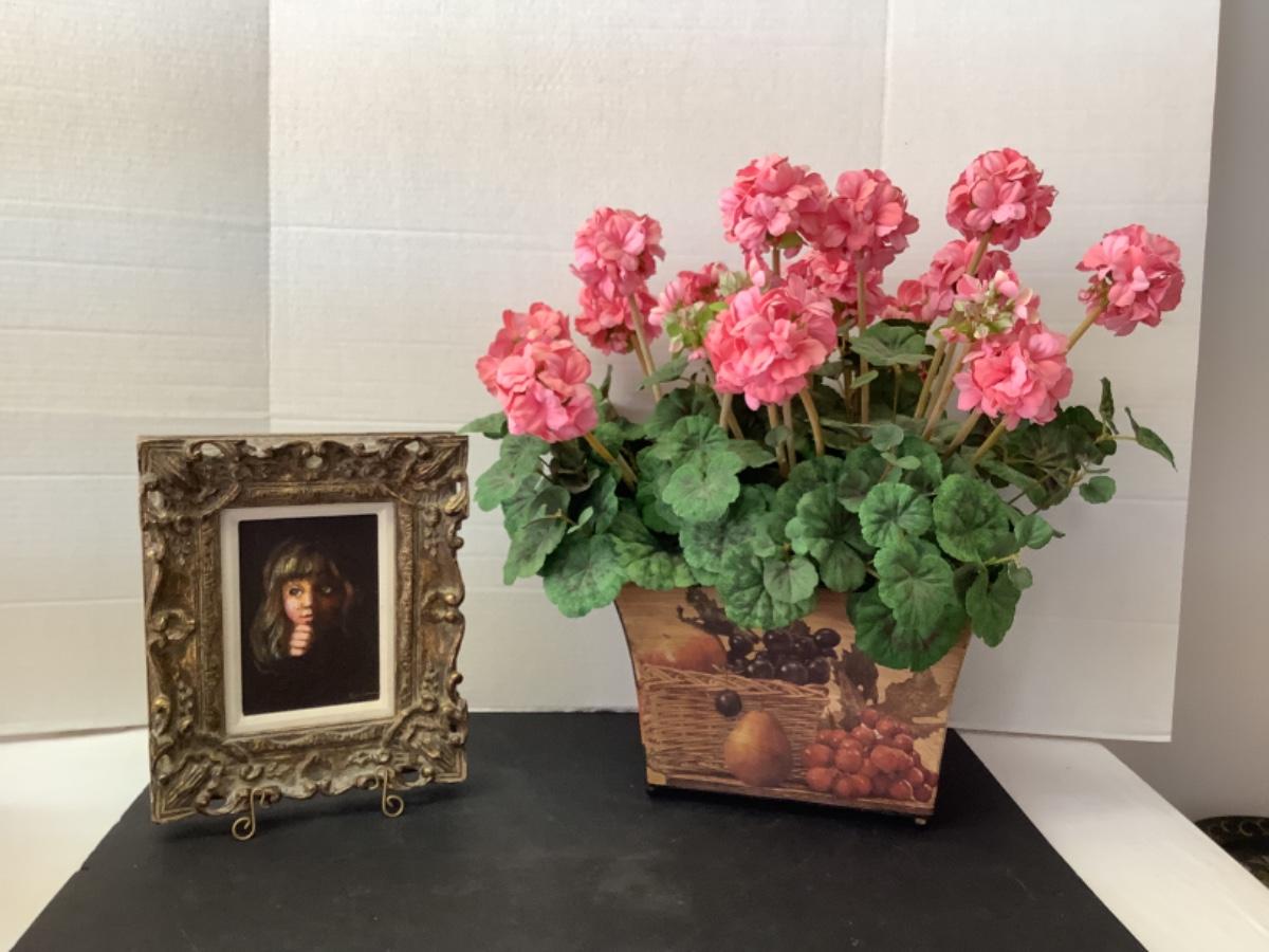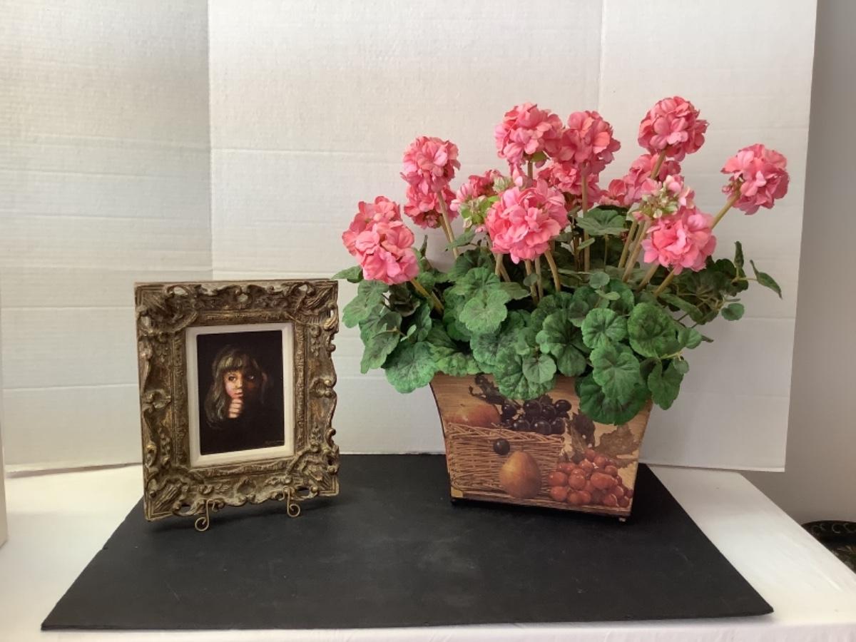 241 Beautiful Arrangement of Faux Geraniums & Framed Oil Portrait