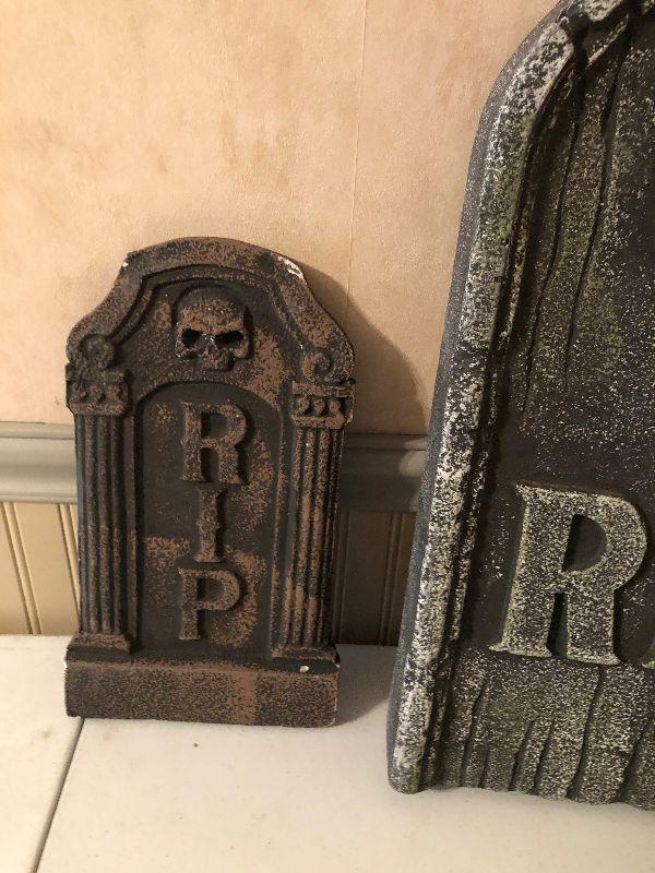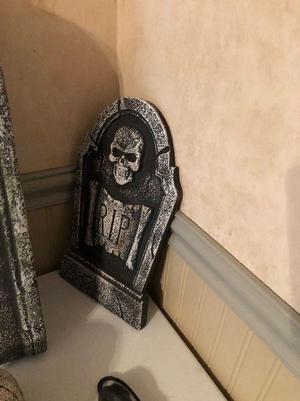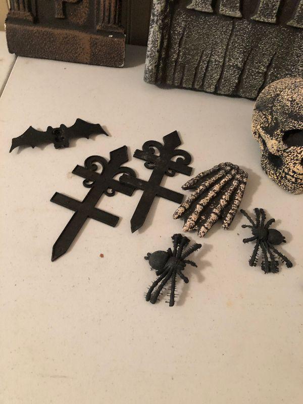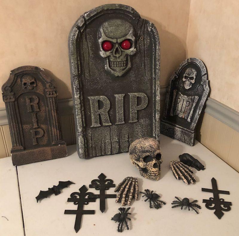 #241 Halloween Situation: Styrofoam Skeleton, Head stone, siders, bats