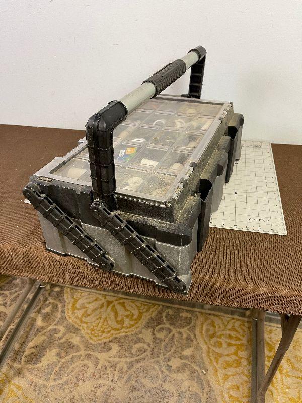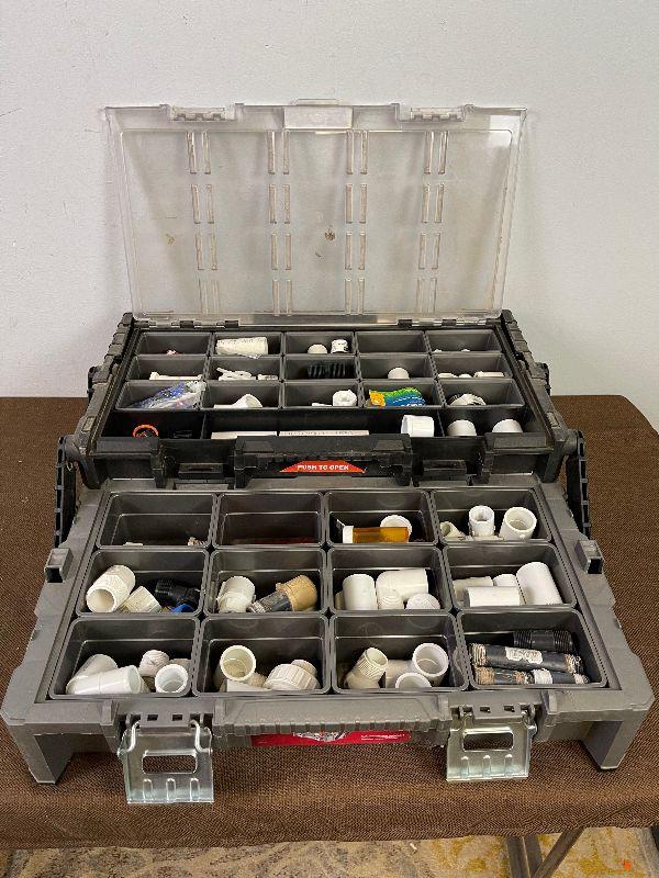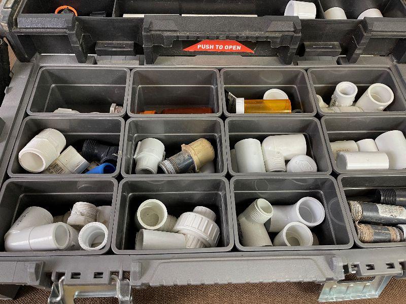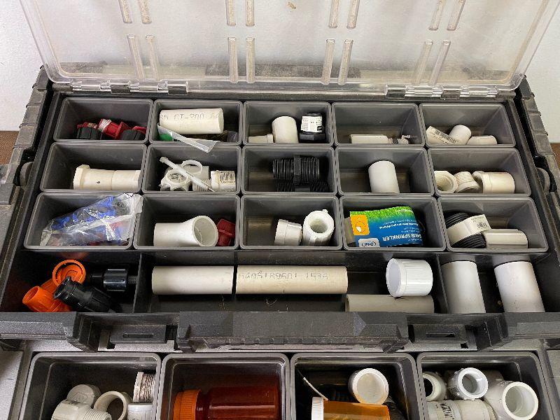 Full of White Plastic Sprinkler Parts. Tool box is Used but is in Excellent Condition!