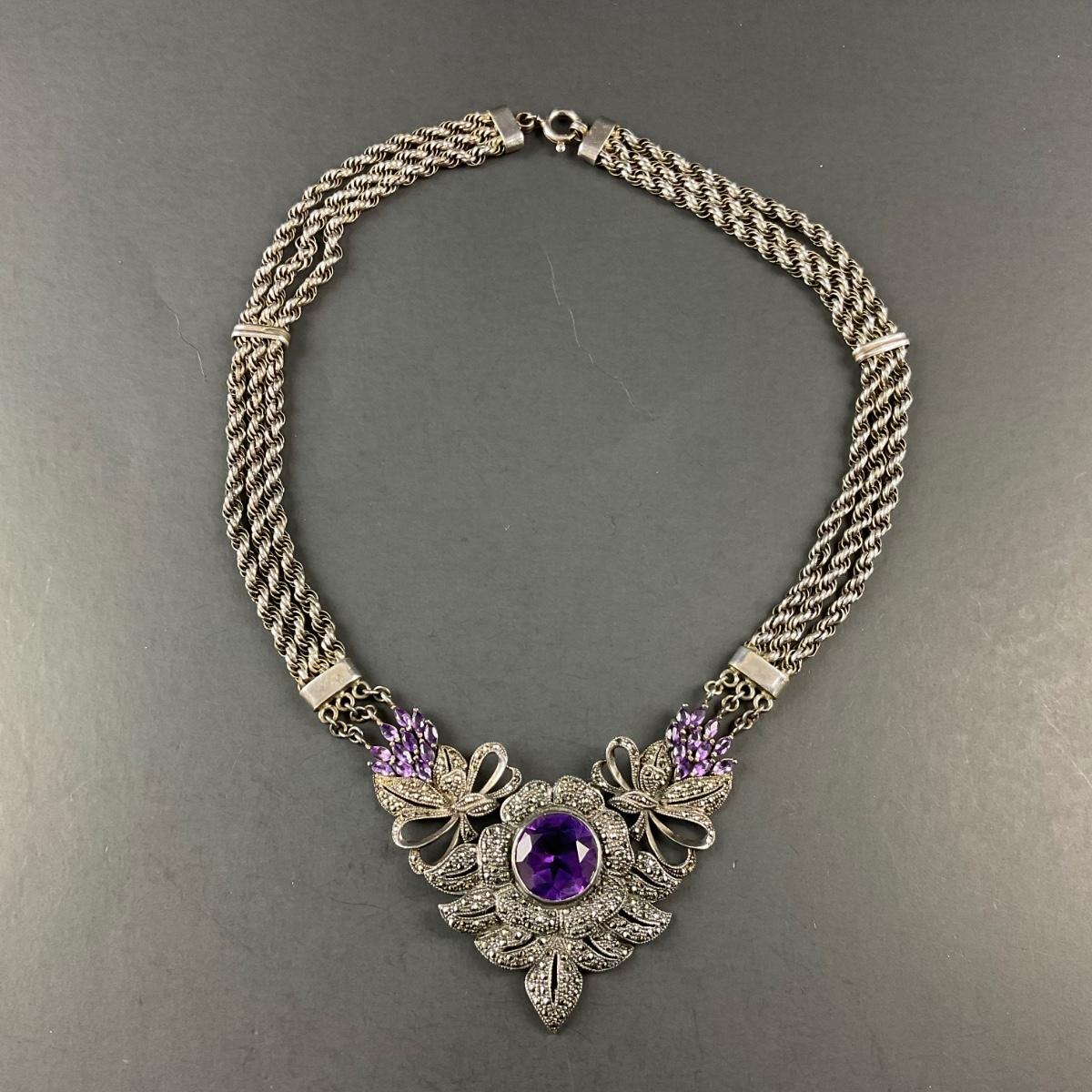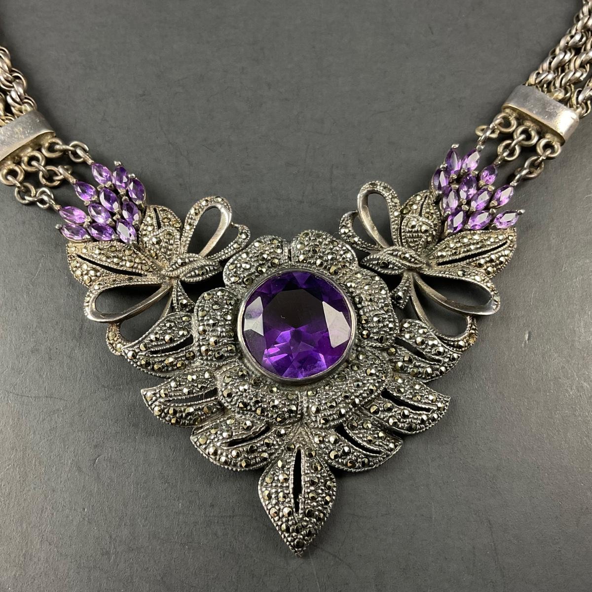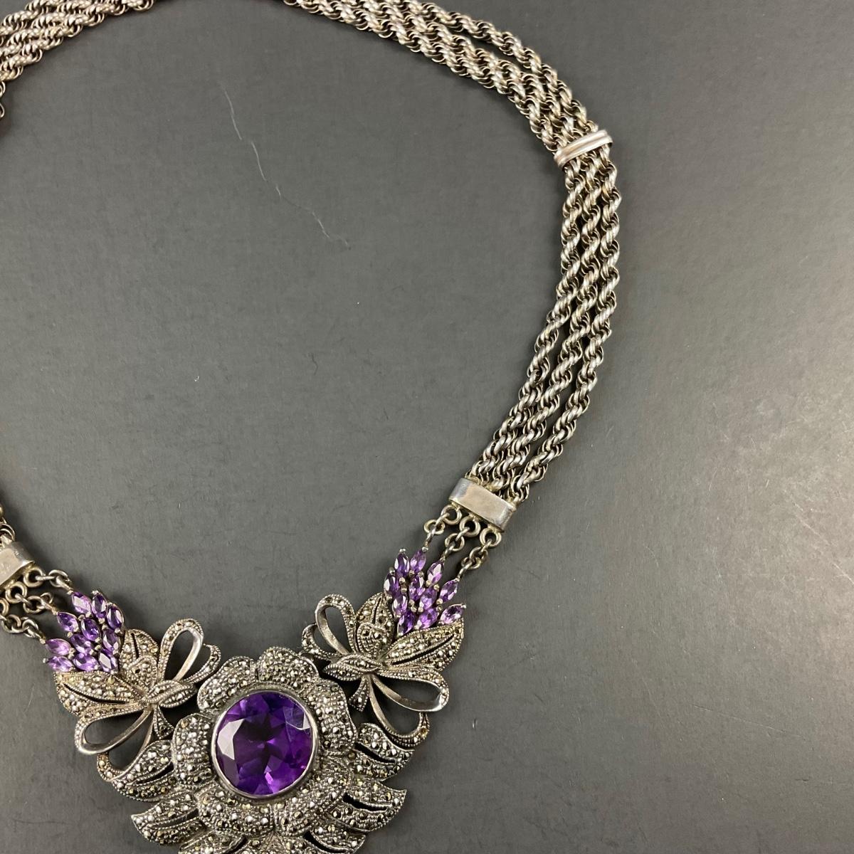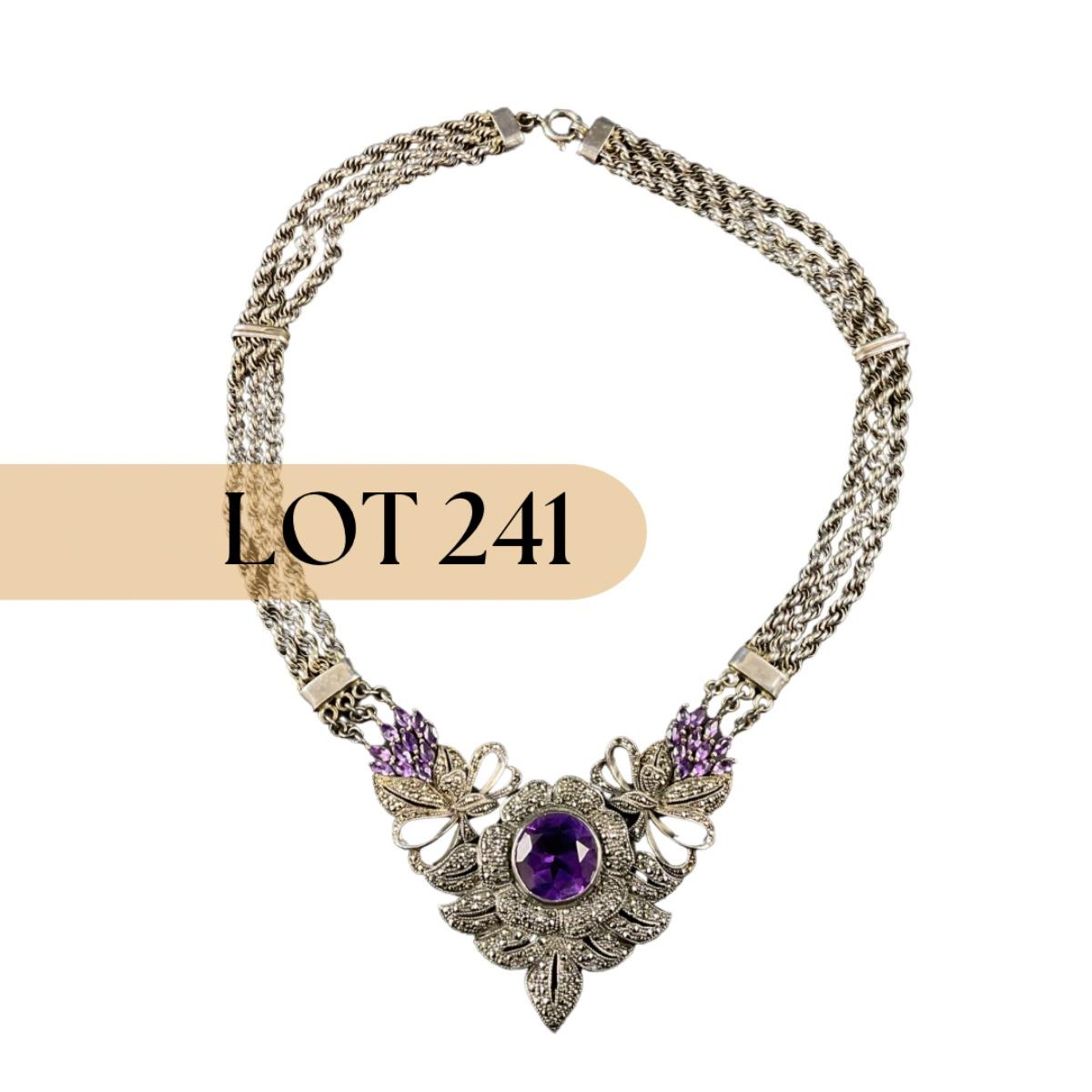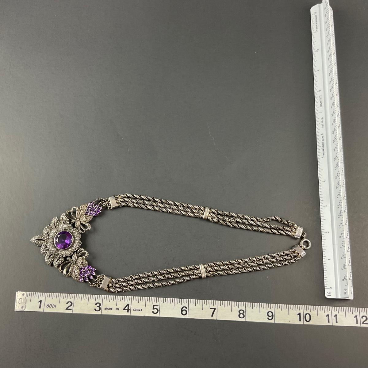 One marked 925 sterling silver and amethyst stone necklace. Total weight of this piece including stones is 81 grams. This piece has no damage, and appears to be in great shape with no visable chips, cracks, or broken pieces. Please see photos for details and condition. Any condition statement is given as a courtesy to a client, is an opinion, and should not be treated as a statement of fact. Reference to condition written, oral or within a condition report shall not be regarded as a full account of condition and may not include all defects, alterations, or restorations. Absence of a condition report does not imply a lot is flawless or lacking imperfections or damage. Katherine’s Auction & Appraisal Service shall have no responsibility for any error or omission. Returns shall not be accepted on the basis of condition. ::: Shipping is available on this lot. If you require shipping you must let us know at the close of the auction. We will coordinate with you after the item has been won. Shipping fees will include insurance up to or exceeding the value of all items being mailed. If you have any questions regarding this lot please contact the auctioneer either via this website, by direct email or by phone. PICK UP TIMES and other important information can be found in the TERMS and DESCRIPTION of the auction. Please take a look for pertinent information. Thanks!