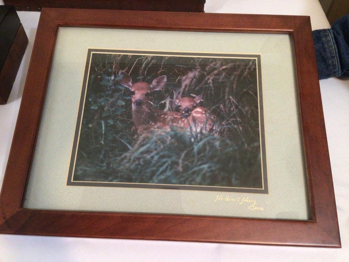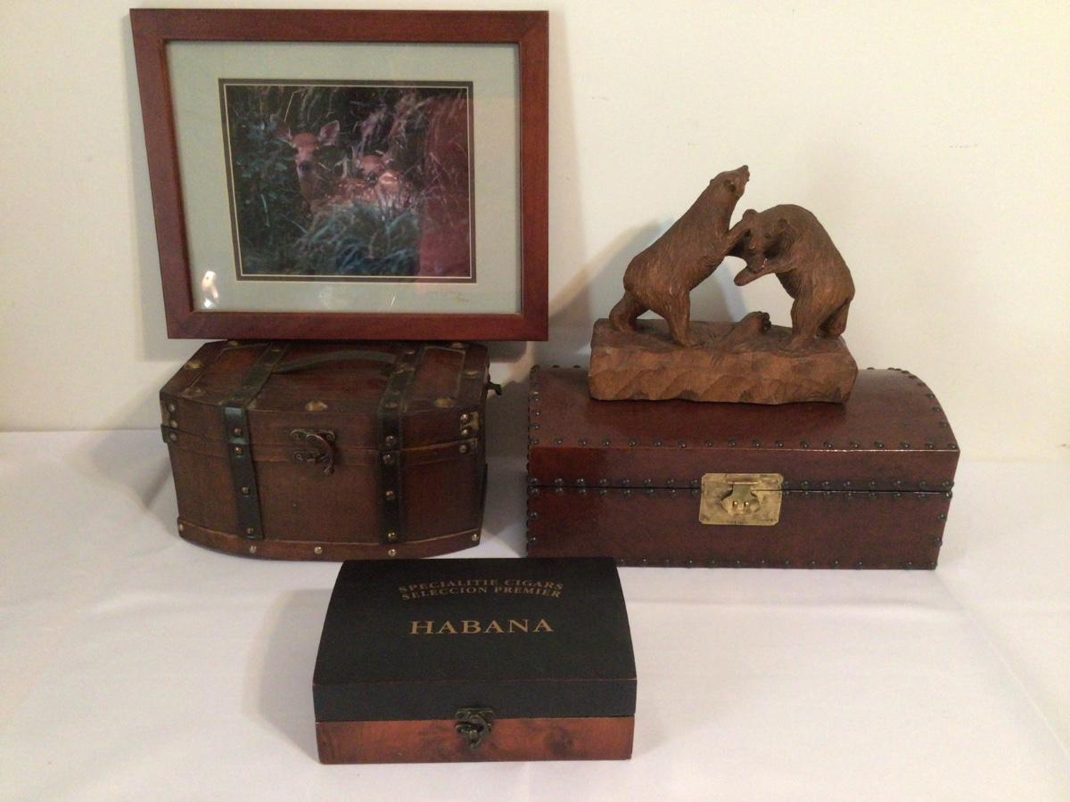The lot contains 3 wooden boxes, carved bear figures and a signed framed photo of deer.