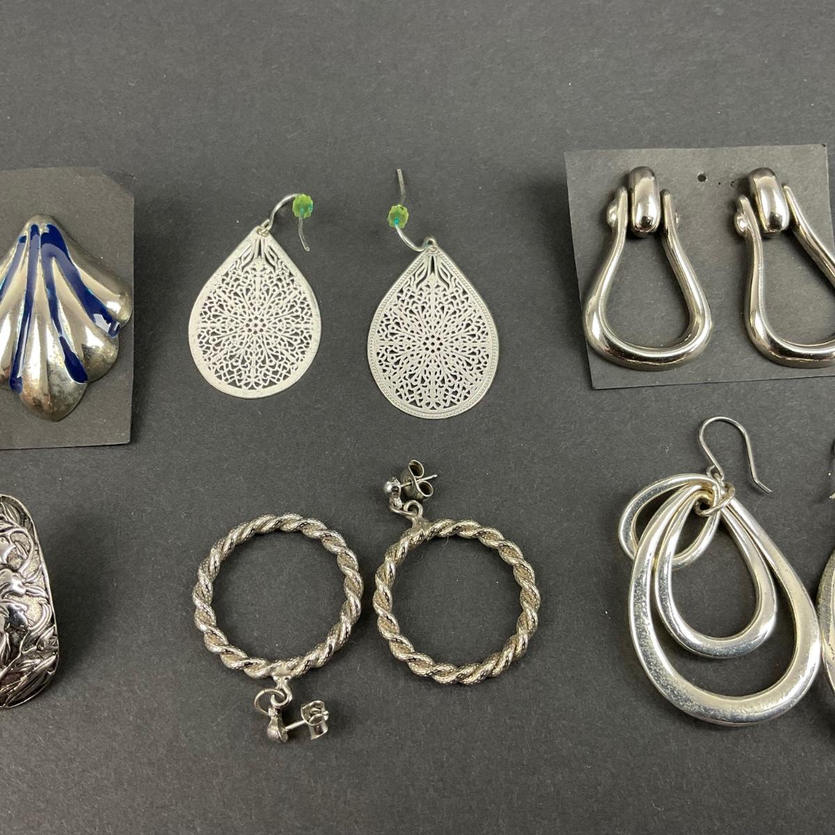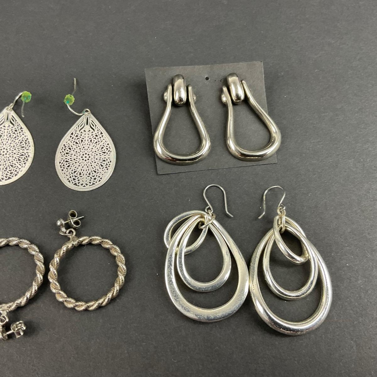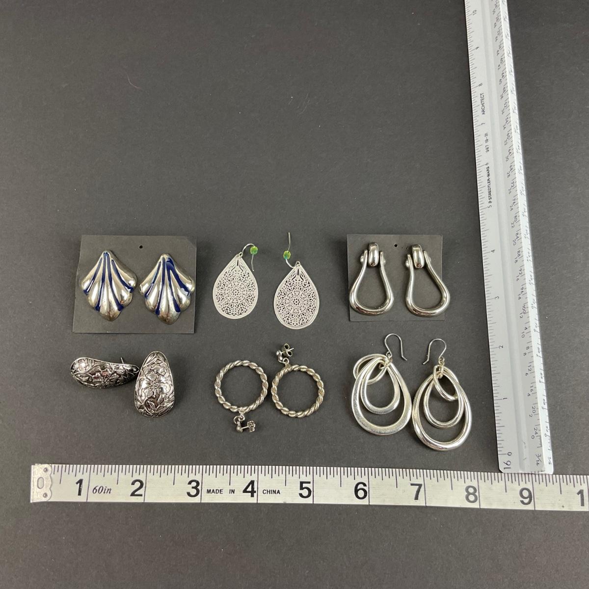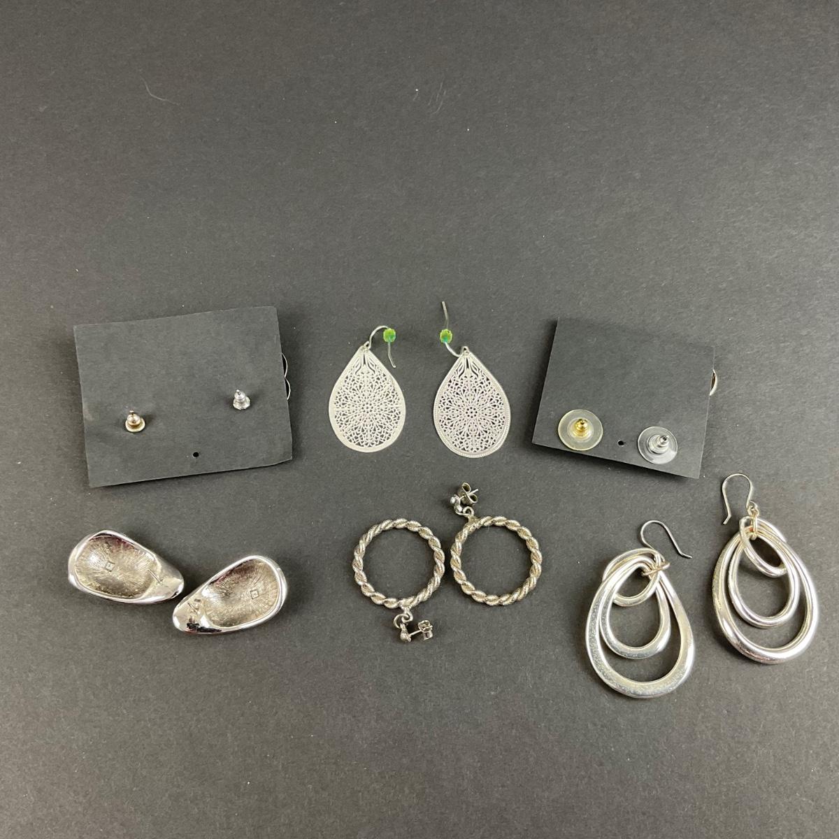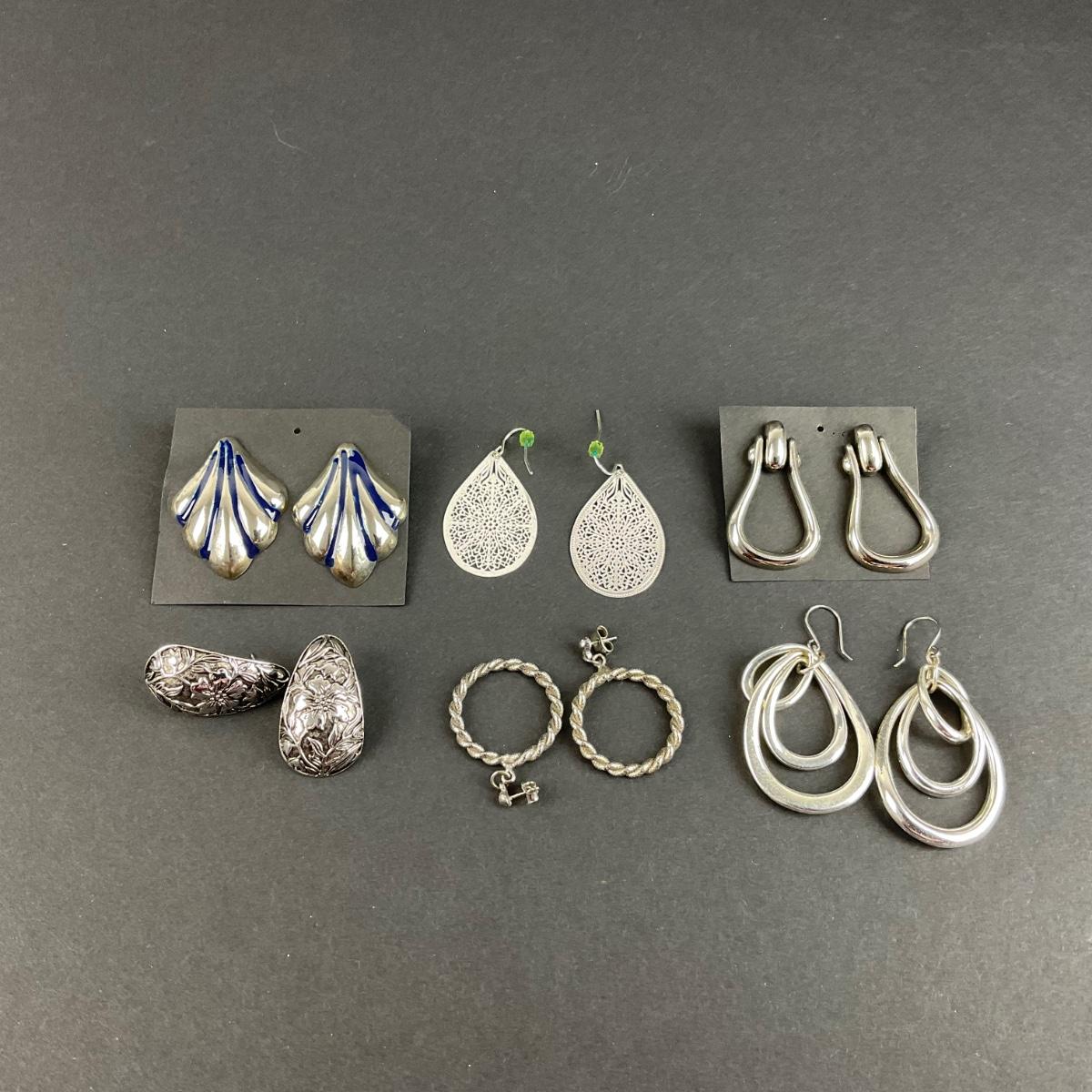 Six pair of assorted silver tone earrings. Please see photos for details and condition. Any condition statement is given as a courtesy to a client, is an opinion, and should not be treated as a statement of fact. Reference to condition written, oral or within a condition report shall not be regarded as a full account of condition and may not include all defects, alterations, or restorations. Absence of a condition report does not imply a lot is flawless or lacking imperfections or damage. Katherine’s Auction & Appraisal Service shall have no responsibility for any error or omission. Returns shall not be accepted on the basis of condition. ::: Shipping is available on this lot. If you require shipping you must let us know at the close of the auction. We will coordinate with you after the item has been won. Shipping fees will include insurance up to or exceeding the value of all items being mailed. If you have any questions regarding this lot please contact the auctioneer either via this website, by direct email or by phone. PICK UP TIMES and other important information can be found in the TERMS and DESCRIPTION of the auction. Please take a look for pertinent information. Thanks!