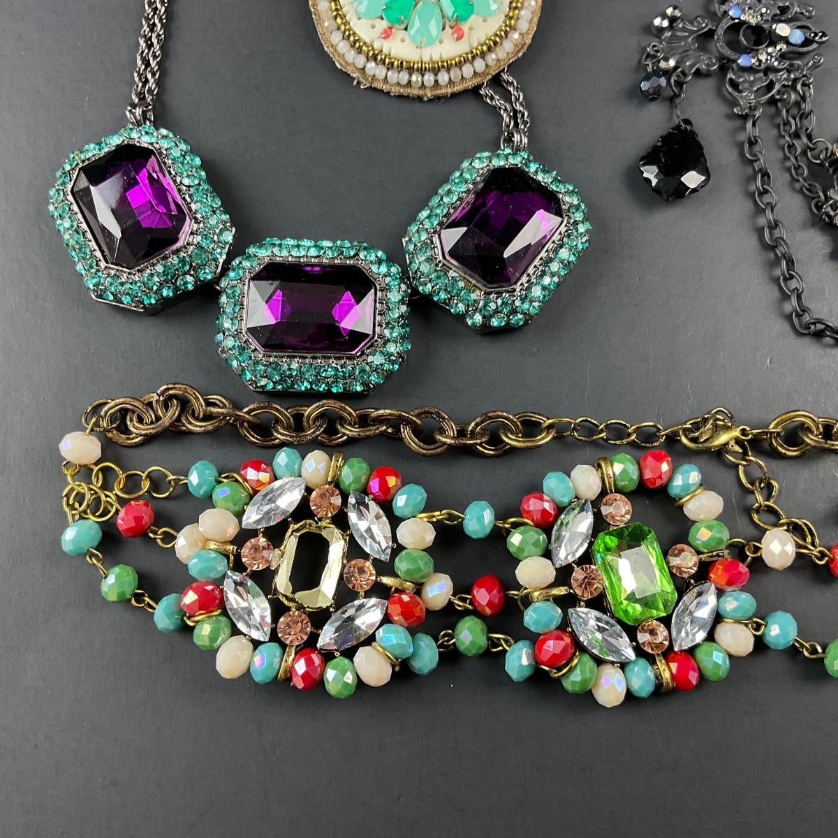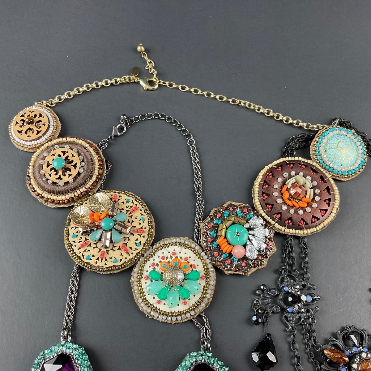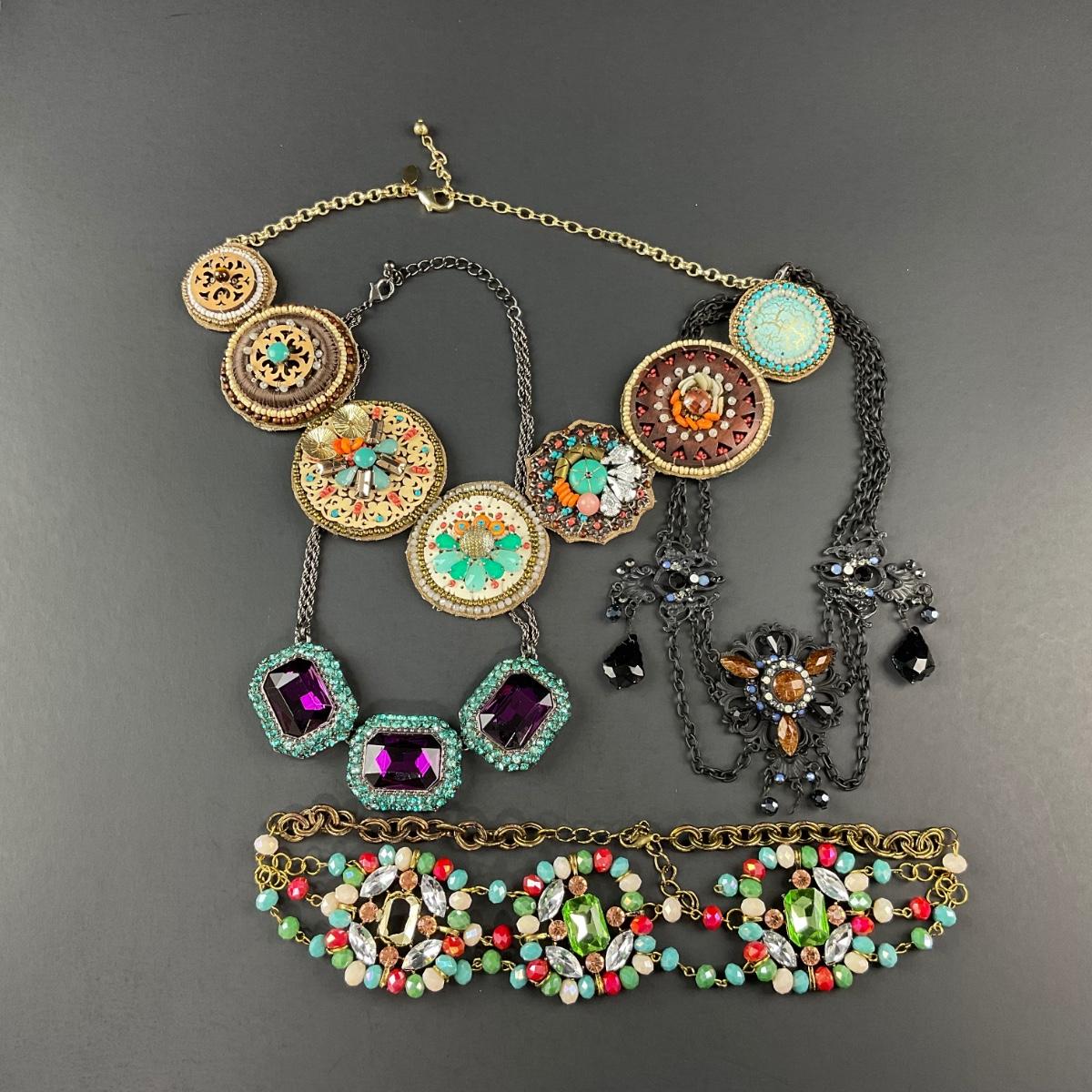 Four costume jewelry pieces of multicolored necklaces. There is some damage on some of these necklaces, but are great pieces for crafting. Please see photos for details and condition. Any condition statement is given as a courtesy to a client, is an opinion, and should not be treated as a statement of fact. Reference to condition written, oral or within a condition report shall not be regarded as a full account of condition and may not include all defects, alterations, or restorations. Absence of a condition report does not imply a lot is flawless or lacking imperfections or damage. Katherine’s Auction & Appraisal Service shall have no responsibility for any error or omission. Returns shall not be accepted on the basis of condition. ::: Shipping is available on this lot. If you require shipping you must let us know at the close of the auction. We will coordinate with you after the item has been won. Shipping fees will include insurance up to or exceeding the value of all items being mailed. If you have any questions regarding this lot please contact the auctioneer either via this website, by direct email or by phone. PICK UP TIMES and other important information can be found in the TERMS and DESCRIPTION of the auction. Please take a look for pertinent information. Thanks!
