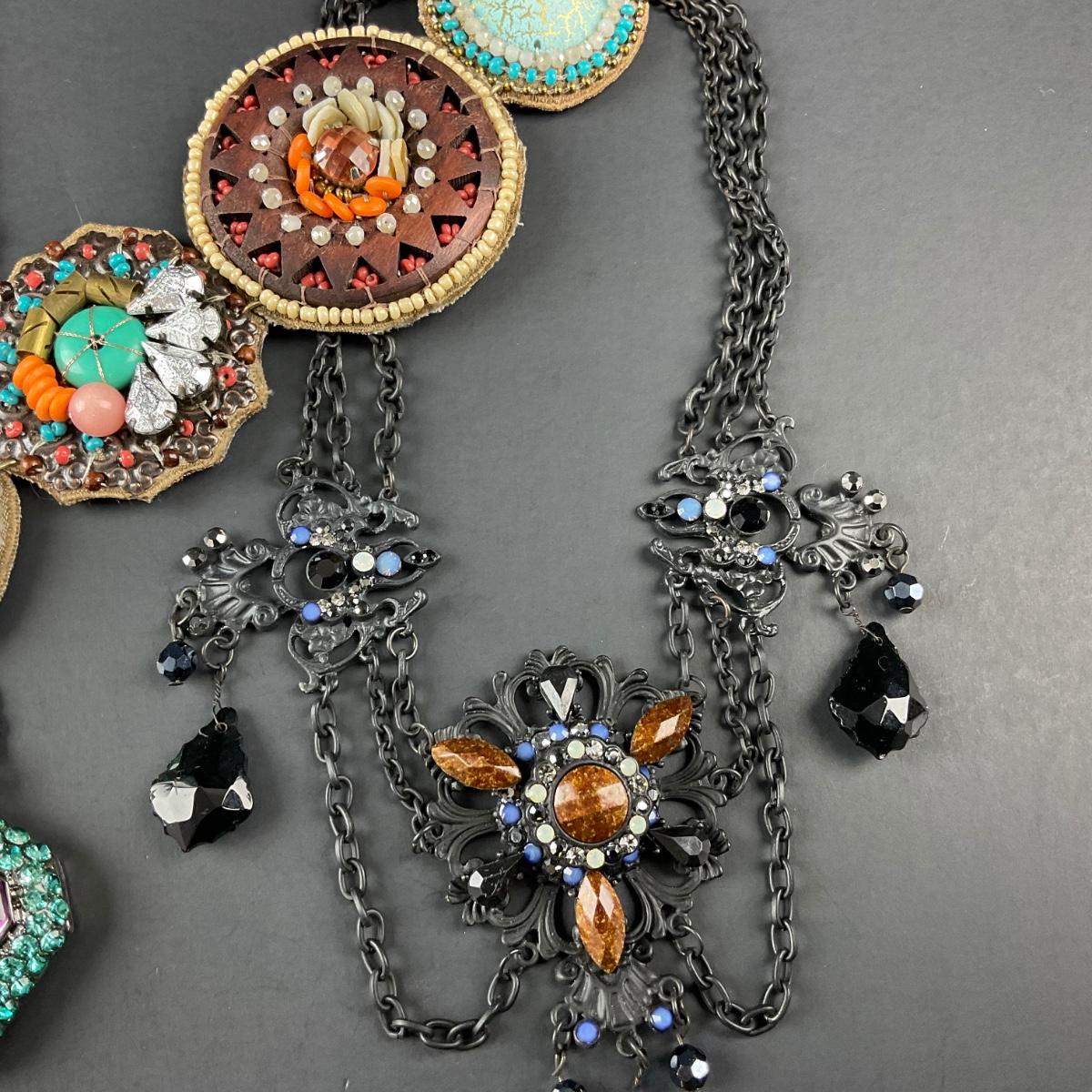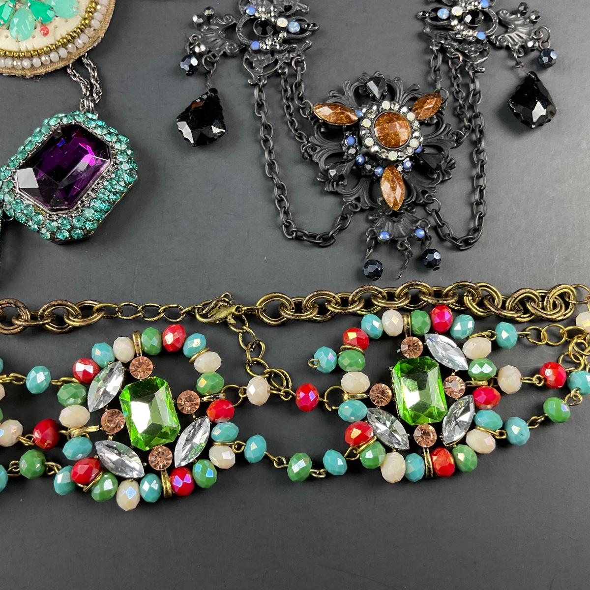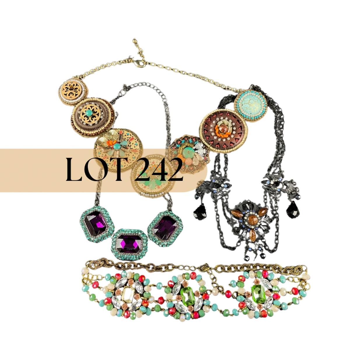 Four costume jewelry pieces of multicolored necklaces. There is some damage on some of these necklaces, but are great pieces for crafting. Please see photos for details and condition. Any condition statement is given as a courtesy to a client, is an opinion, and should not be treated as a statement of fact. Reference to condition written, oral or within a condition report shall not be regarded as a full account of condition and may not include all defects, alterations, or restorations. Absence of a condition report does not imply a lot is flawless or lacking imperfections or damage. Katherine’s Auction & Appraisal Service shall have no responsibility for any error or omission. Returns shall not be accepted on the basis of condition. ::: Shipping is available on this lot. If you require shipping you must let us know at the close of the auction. We will coordinate with you after the item has been won. Shipping fees will include insurance up to or exceeding the value of all items being mailed. If you have any questions regarding this lot please contact the auctioneer either via this website, by direct email or by phone. PICK UP TIMES and other important information can be found in the TERMS and DESCRIPTION of the auction. Please take a look for pertinent information. Thanks!