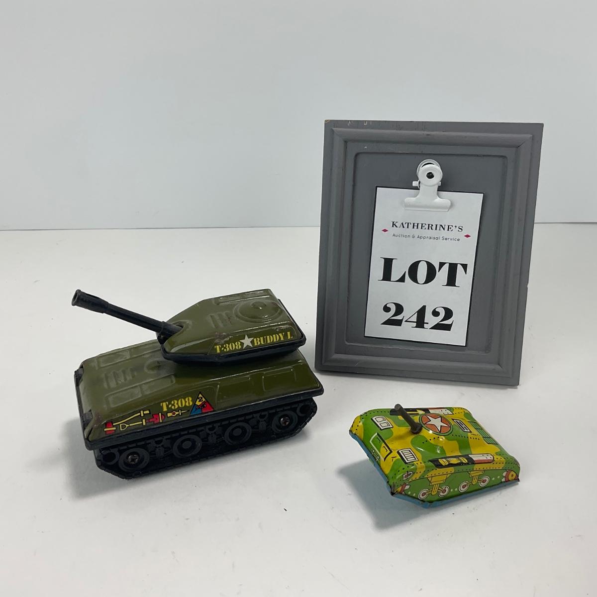 Two vintage tin toy tanks. Please see photos for details and condition. ::: Shipping is available on this lot. If you require shipping you must let us know at the close of the auction. We will coordinate with you after the item has been won. Shipping fees will include insurance up to or exceeding the value of all items being mailed. If you have any questions regarding this lot please contact the auctioneer either via this website, by direct email or by phone. PICK UP TIMES and other important information can be found in the TERMS and DESCRIPTION of the auction. Please take a look for pertinent information. Thanks!