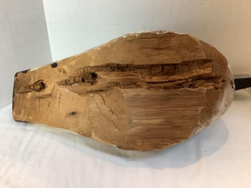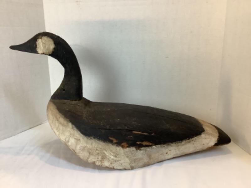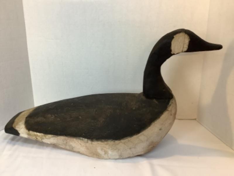 Vintage wood goose decoy has some damage on bottom (see photos), measures approximately 13-1/2” high and 25-1/2” long