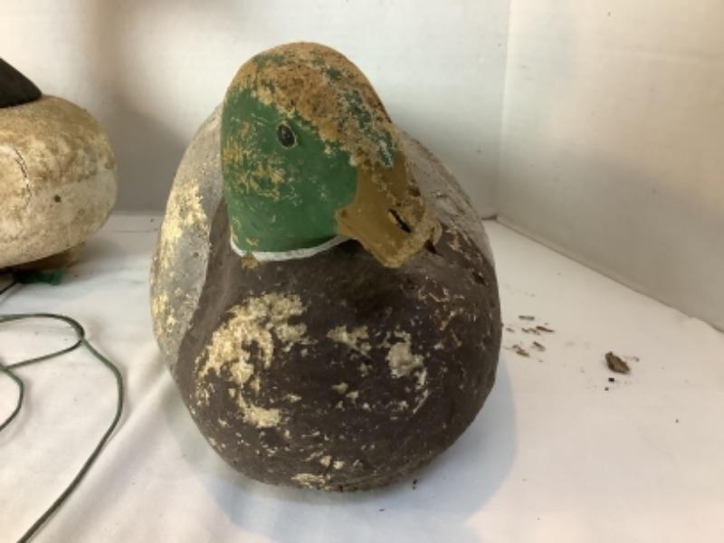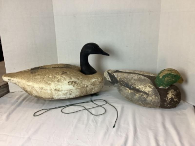 Goose decoy measures approximately 21” long and 12-1/2” high. Duck decoy measures approximately 16” long and 8” high, has a broken beak (see photos), both decoys are styrofoam