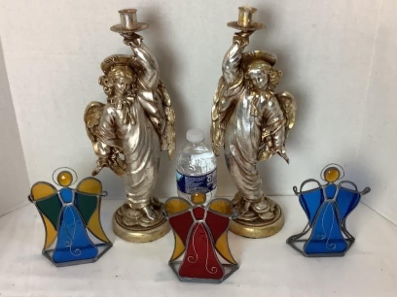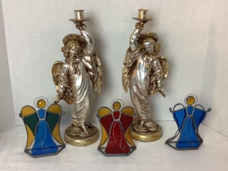 Pair of metallic painted angel candlesticks and 3 stained glass style tea light holders