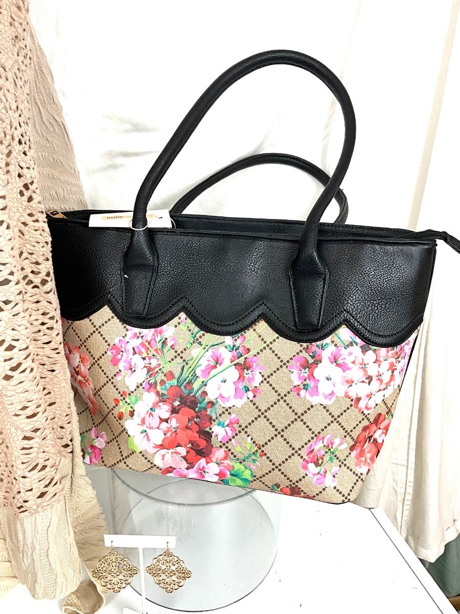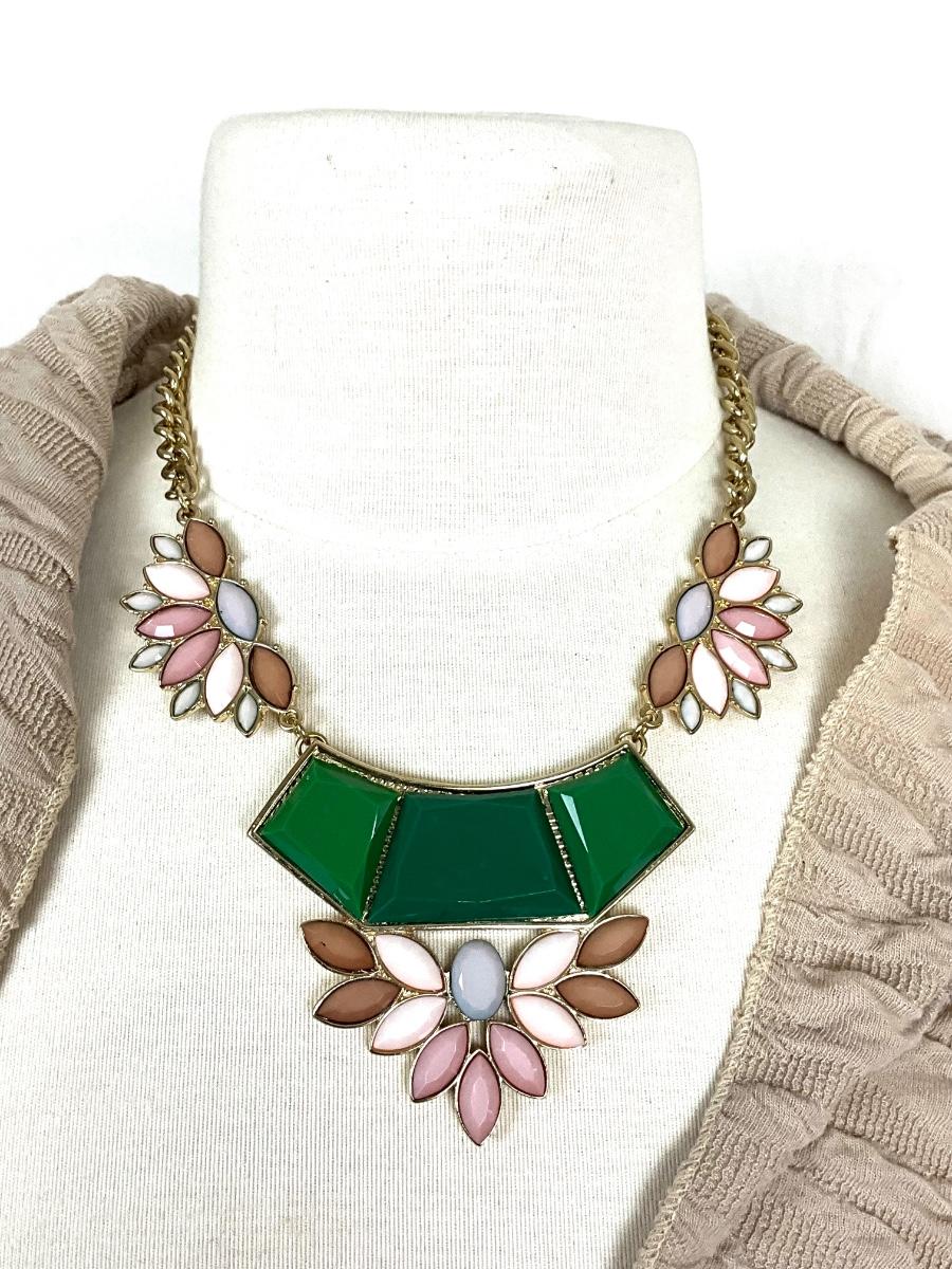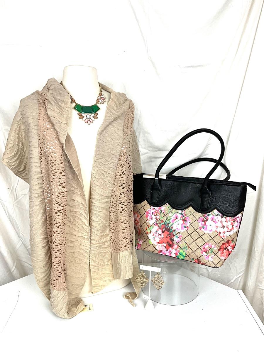 243 Floral Handbag with Taupe Crochet Shawl/Wrap, Green Beaded Necklace, Gold Tone Earrings