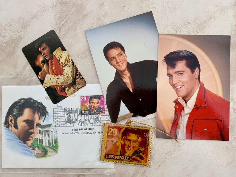 #243 GROUP OF ELVIS PRESLEY ITEMS PLATE STAMPS PICTURE CARDS ORNAMENT