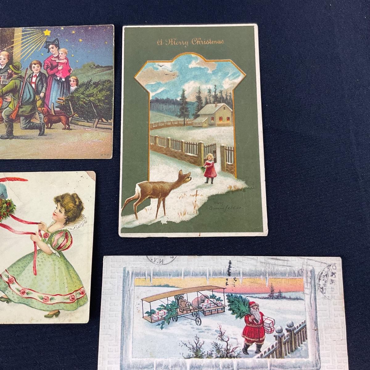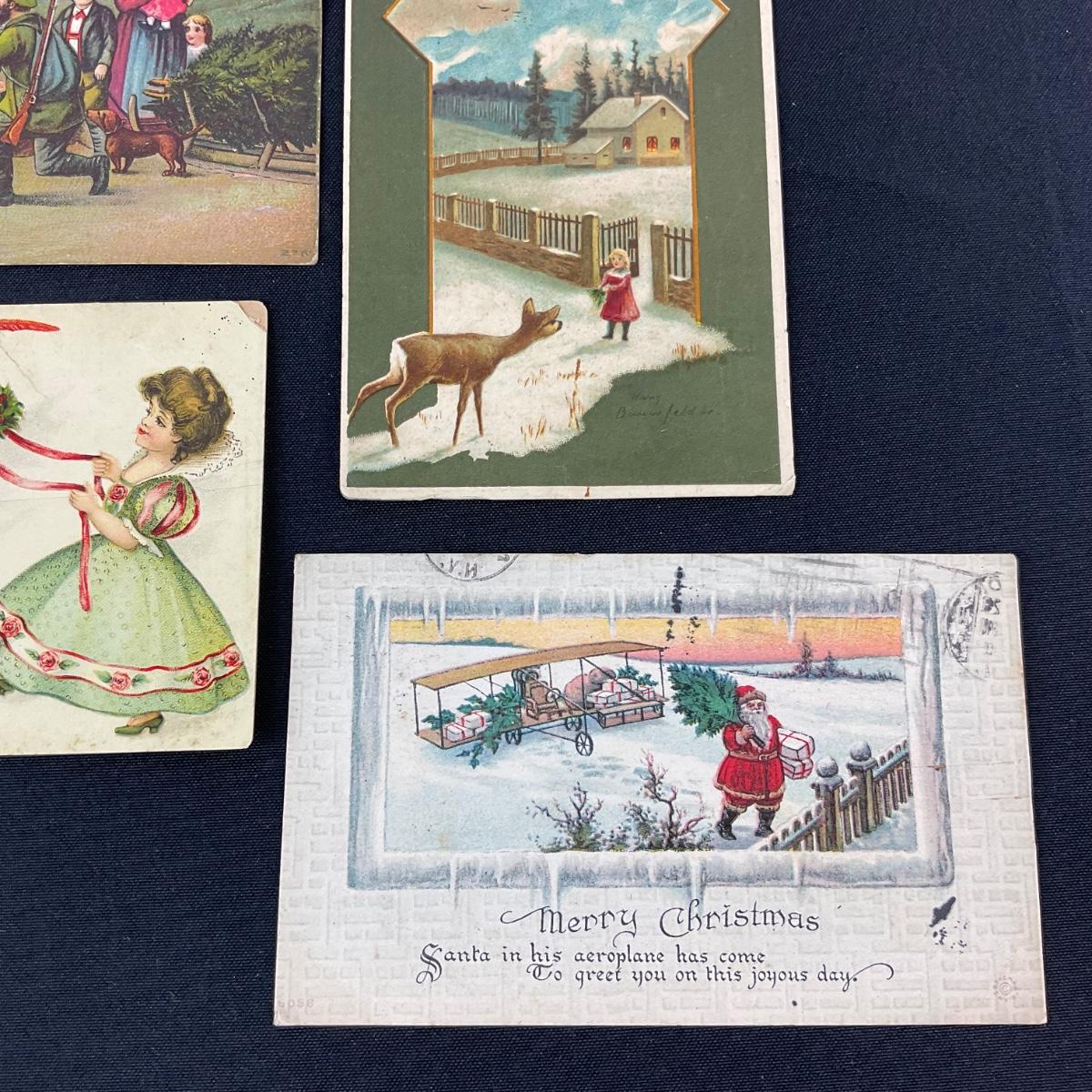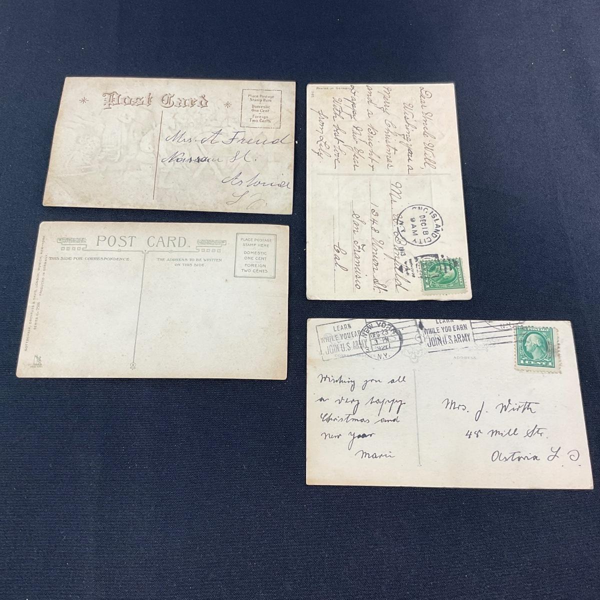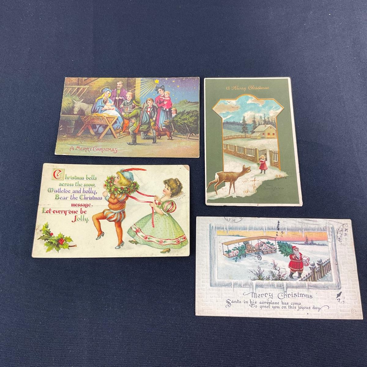 Four vintage assorted Christmas postcards. Please see photos for details and condition. Any condition statement is given as a courtesy to a client, is an opinion, and should not be treated as a statement of fact. Reference to condition written, oral or within a condition report shall not be regarded as a full account of condition and may not include all defects, alterations, or restorations. Absence of a condition report does not imply a lot is flawless or lacking imperfections or damage. Katherine’s Auction & Appraisal Service shall have no responsibility for any error or omission. Returns shall not be accepted on the basis of condition. ::: Shipping is available on this lot. If you require shipping you must let us know at the close of the auction. We will coordinate with you after the item has been won. Shipping fees will include insurance up to or exceeding the value of all items being mailed. If you have any questions regarding this lot please contact the auctioneer either via this website, by direct email or by phone. PICK UP TIMES and other important information can be found in the TERMS and DESCRIPTION of the auction. Please take a look for pertinent information. Thanks!