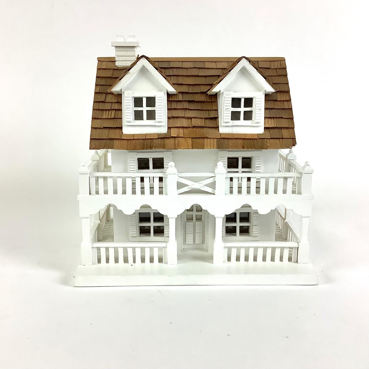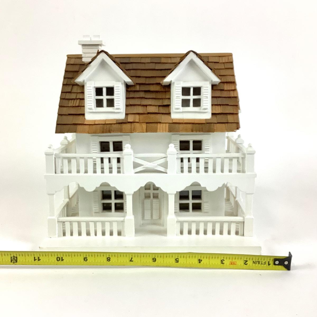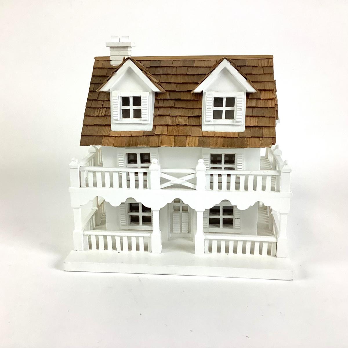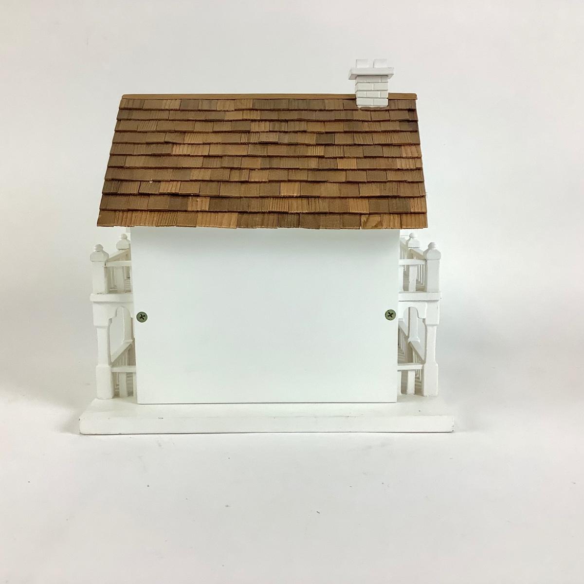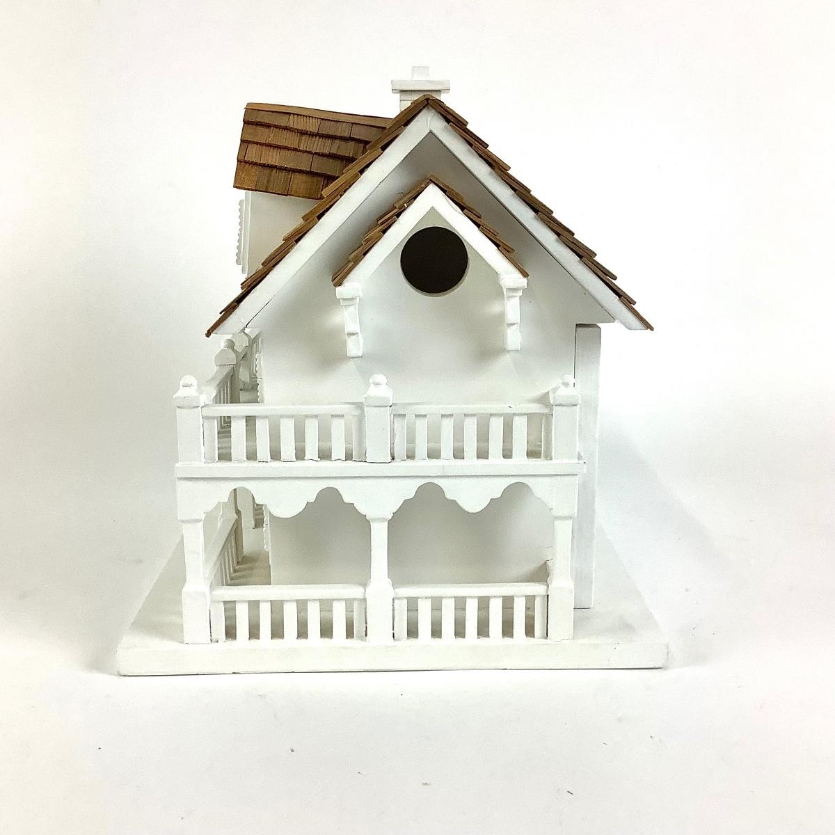 Wood birdhouse painted white with brown cedar shake roof and picket railing on porch and balcony. Measures 10"H, 10.5"W, 9.5"D.