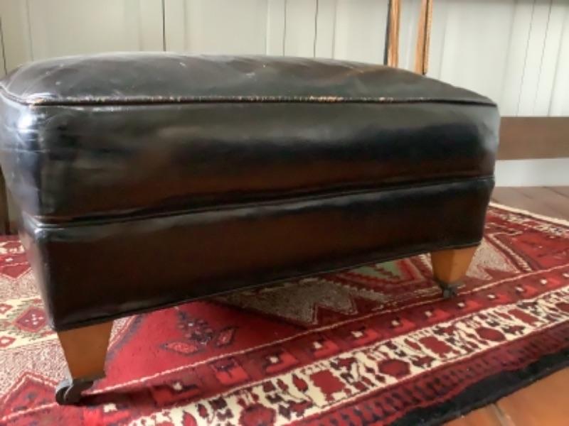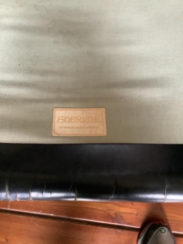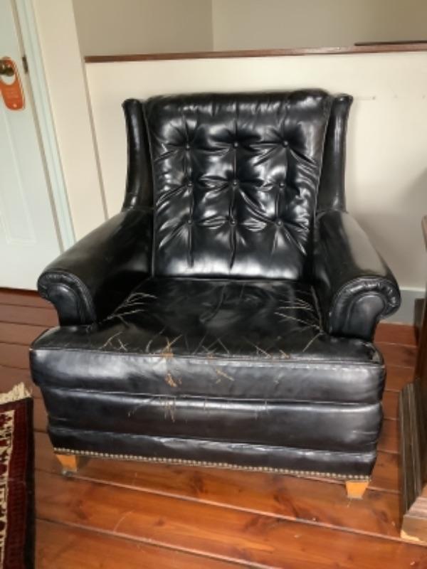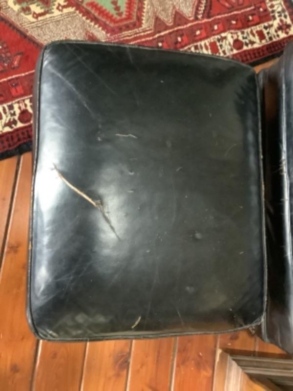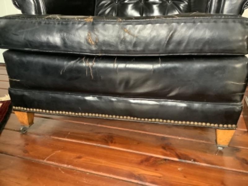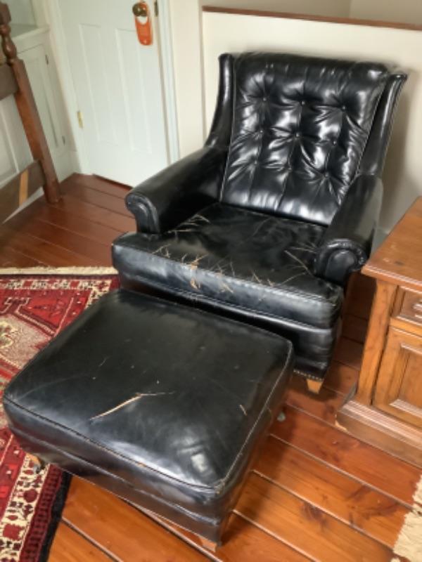 Vintage Sherrill black leather armchair with matching ottoman, both chair and ottoman have wheels and both have cracks in the leather, chair measures 32” high 33” wide and 34” deep