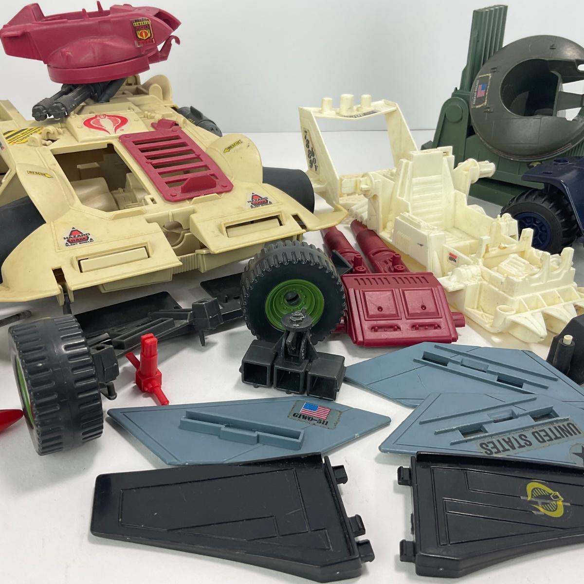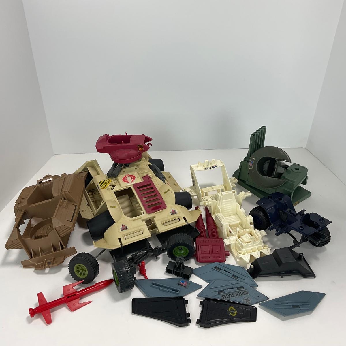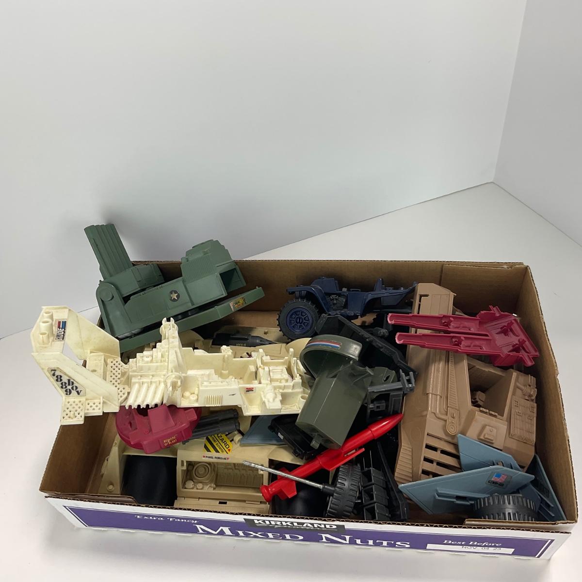 Box full of vintage GI Joe parts and pieces. Some of these pieces are in rough shape. Please see photos for details and condition. ::: Shipping is available on this lot. If you require shipping you must let us know at the close of the auction. We will coordinate with you after the item has been won. Shipping fees will include insurance up to or exceeding the value of all items being mailed. If you have any questions regarding this lot please contact the auctioneer either via this website, by direct email or by phone. PICK UP TIMES and other important information can be found in the TERMS and DESCRIPTION of the auction. Please take a look for pertinent information. Thanks!