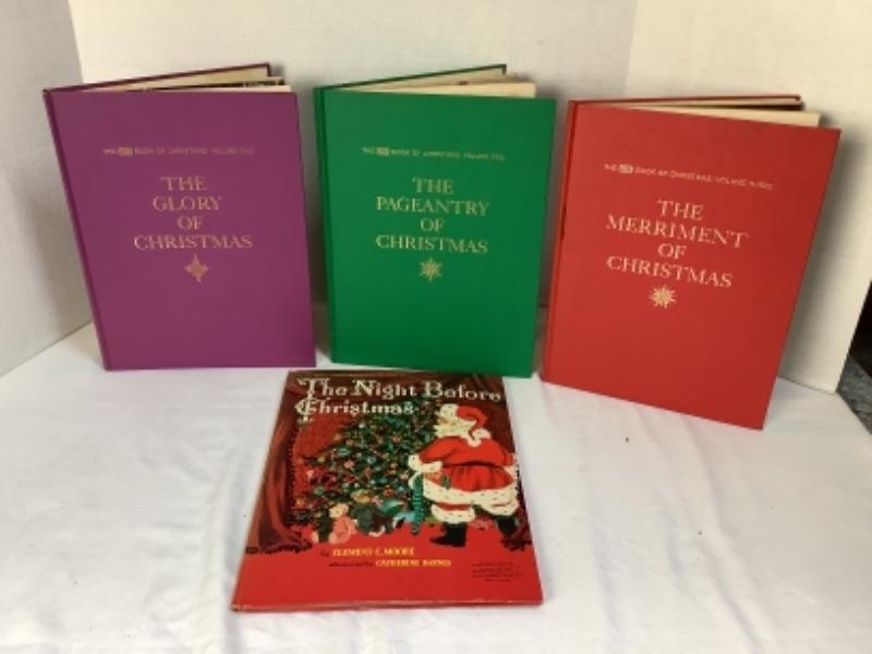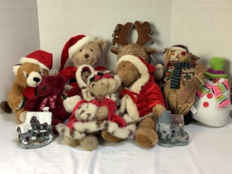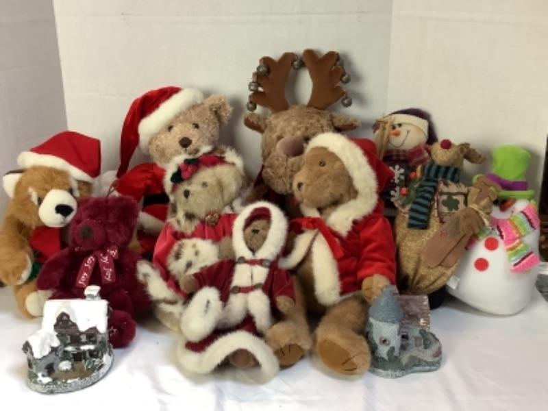 Assorted Christmas plush animals, 3 Boyd’s Bears Christmas bears, 2 small decorative houses, The Night Before Christmas book and The Life Book of Christmas books volumes 1,2 & 3
