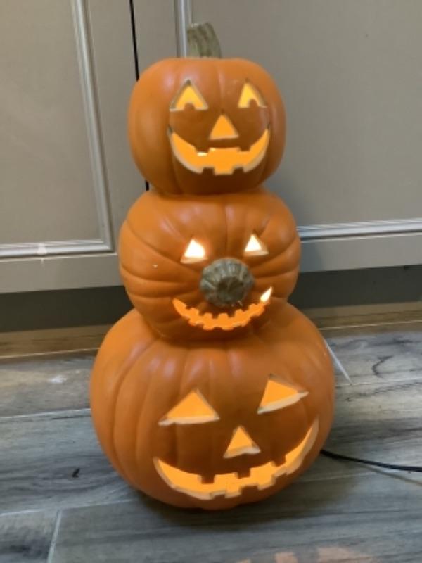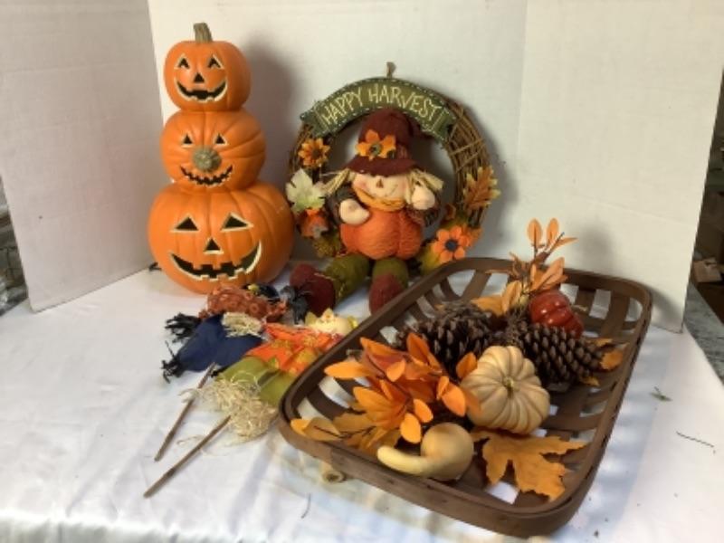 Light up pumpkins decor, Happy Harvest wreath, Harvest basket and 2 scarecrows