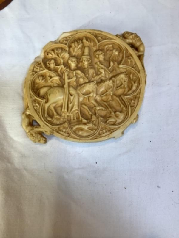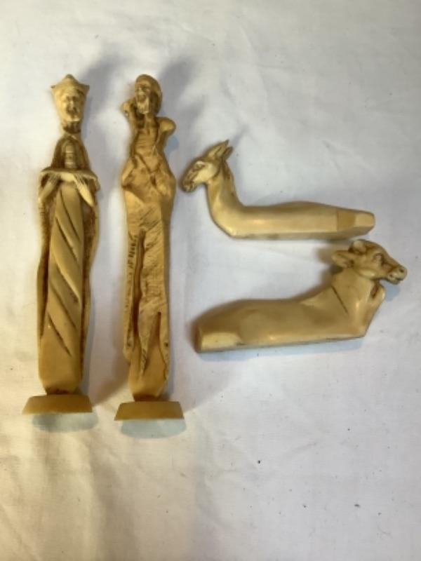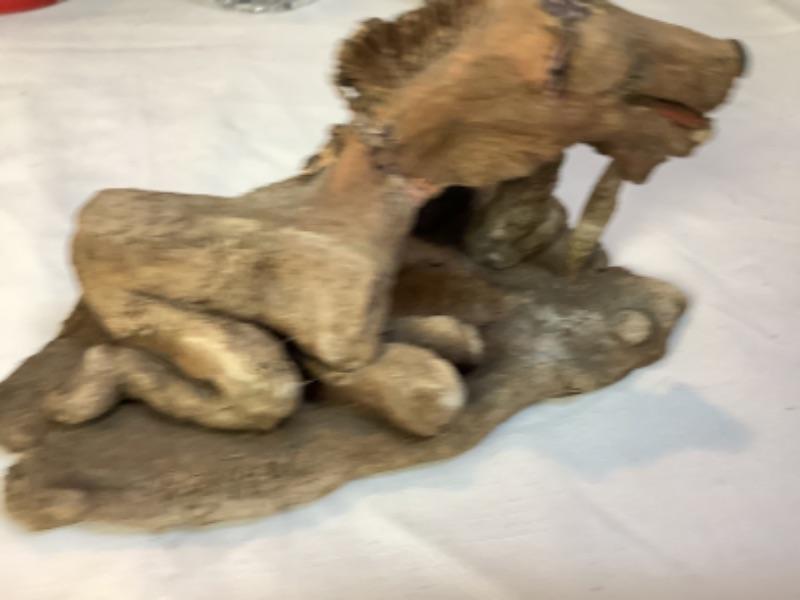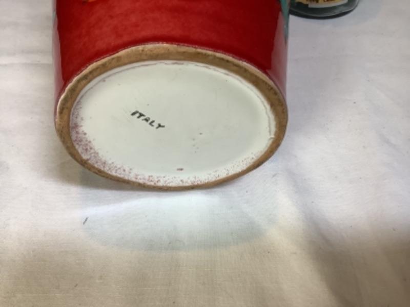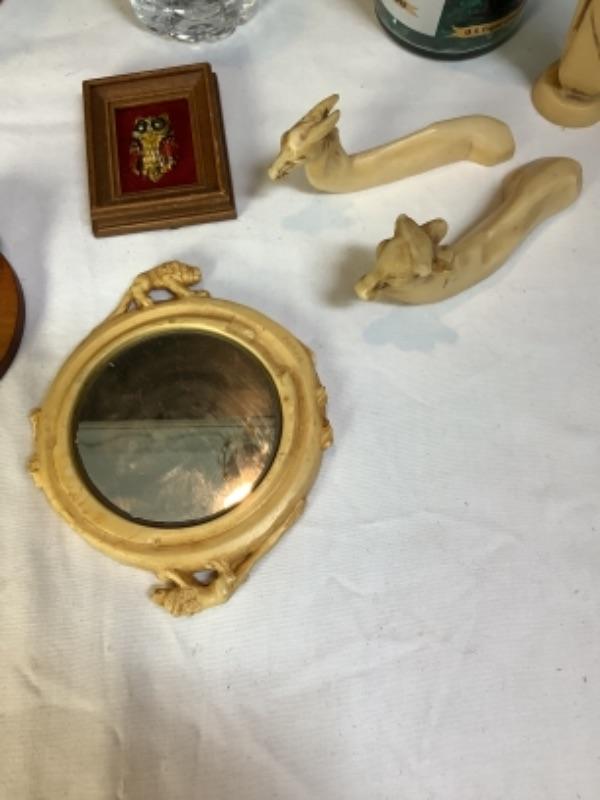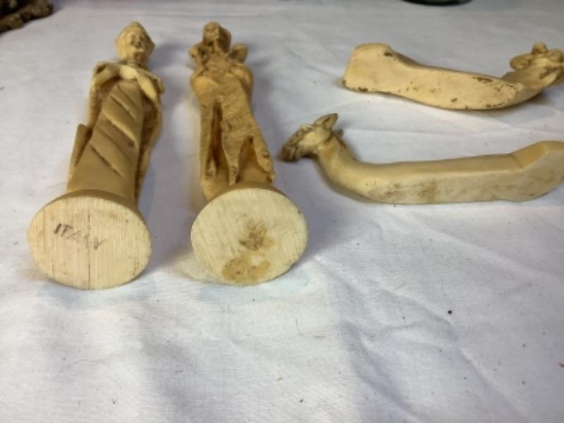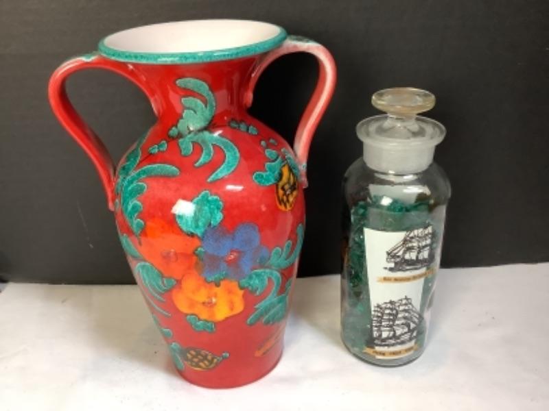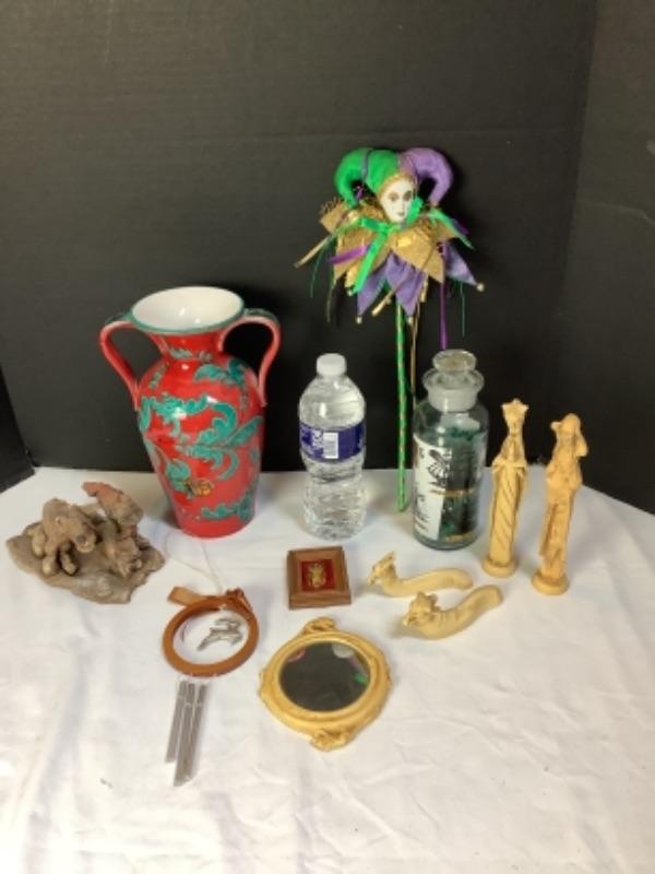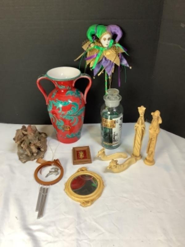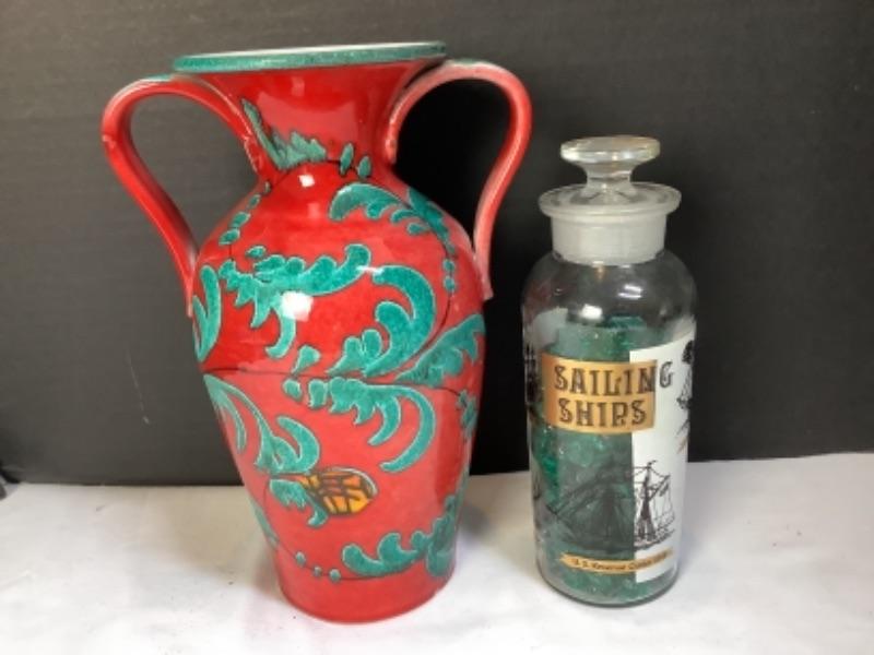 Two handled vase made in Italy, Carved figures stamped Italy on bottom, D. Zigged signed clay sculpture, Sailing ships glass bottle , small mirror is chipped