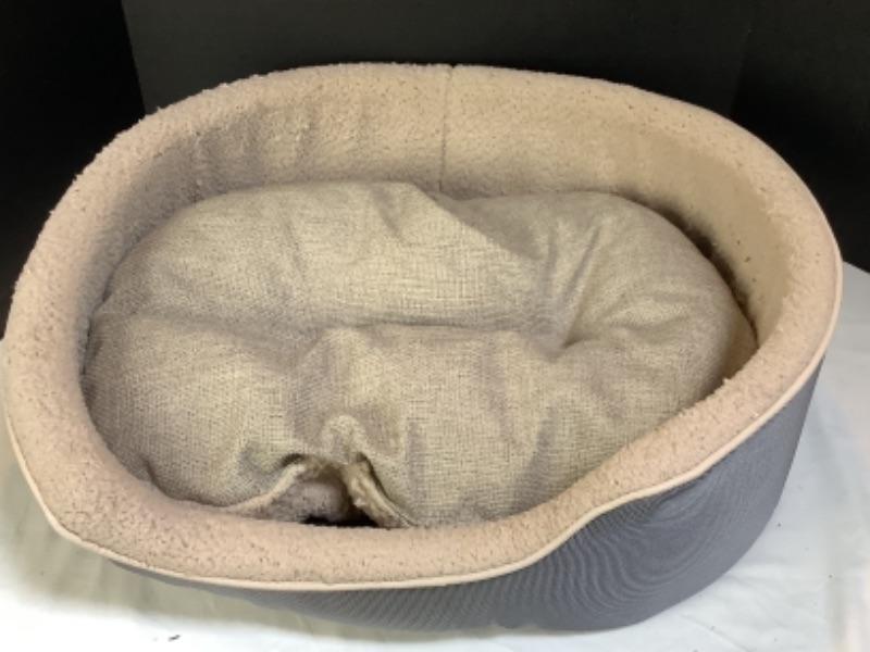 Pillow has been chewed (see photos), it is removable, rest of bed is in like new condition and measures 23” x 22” x 7-1/2” deep