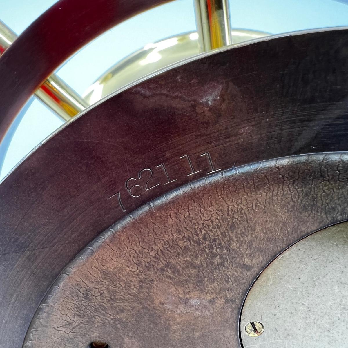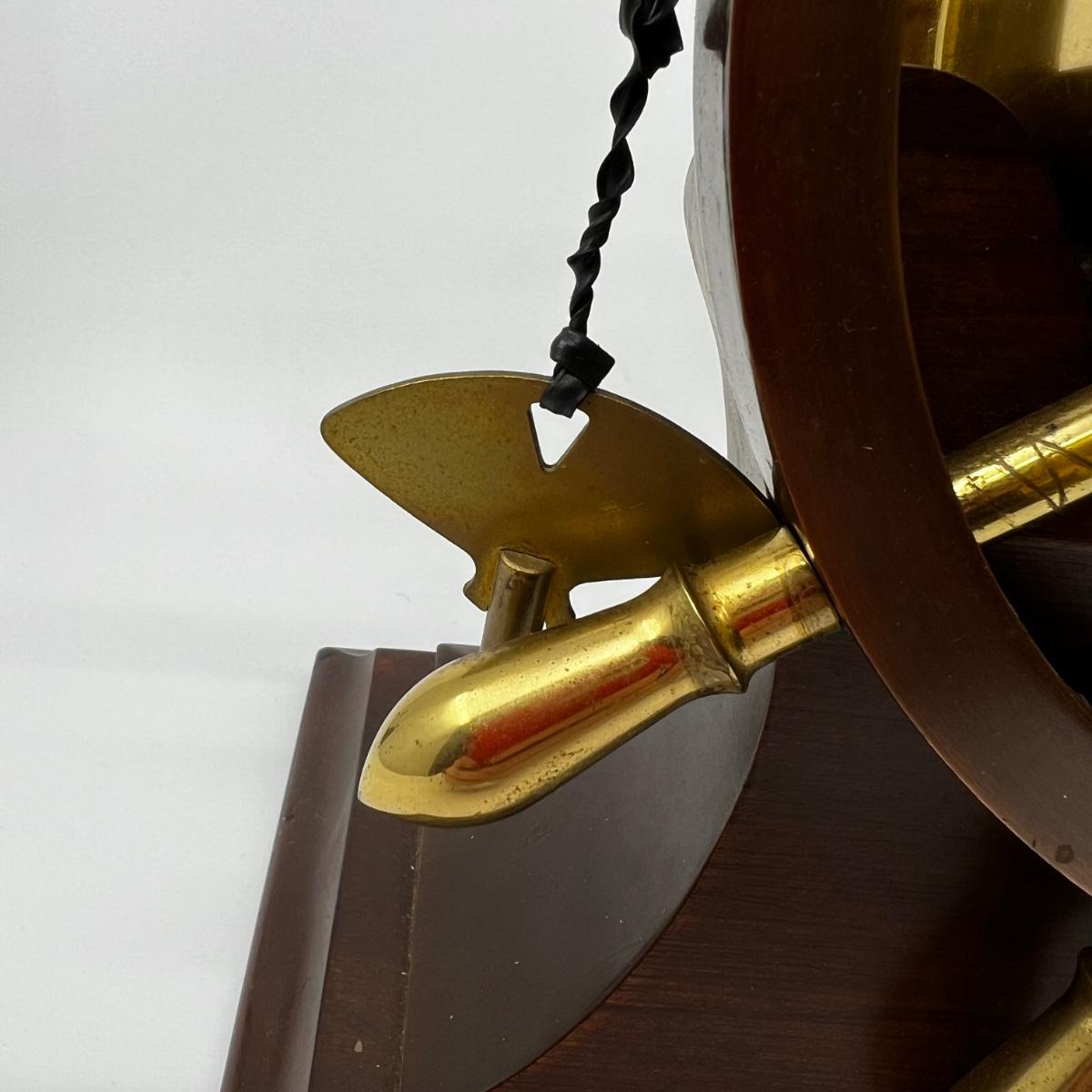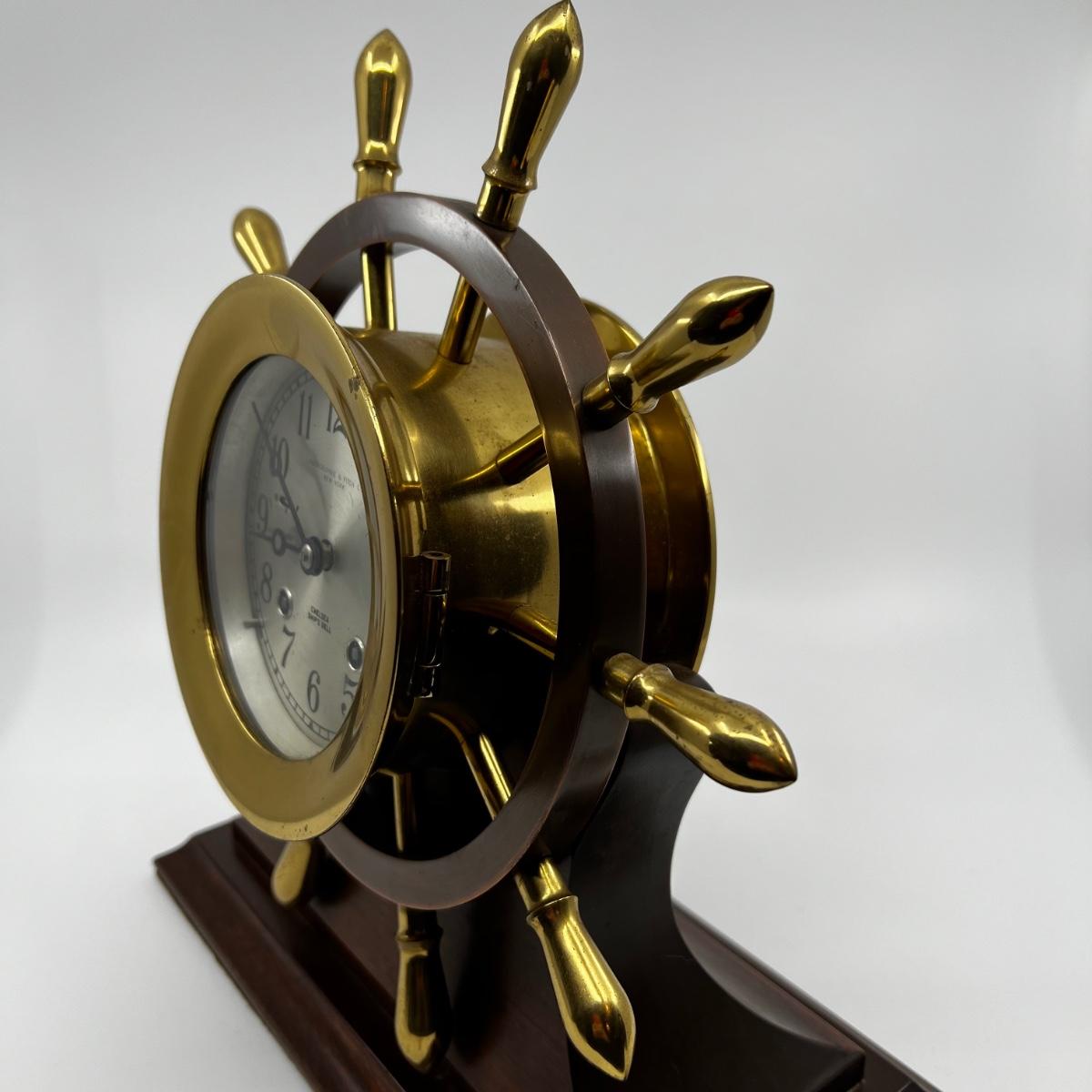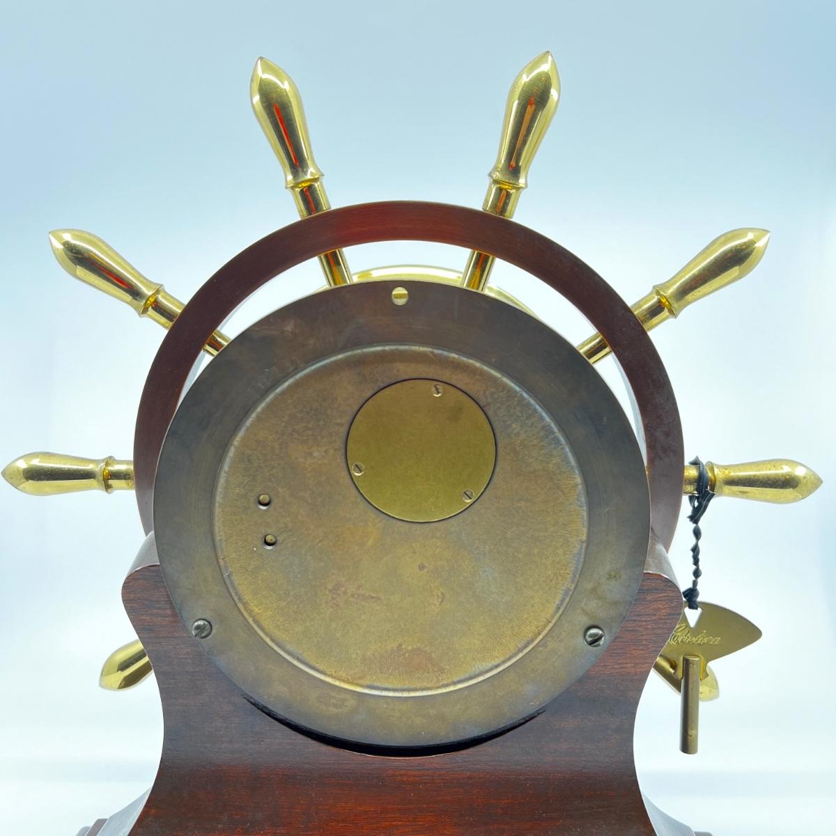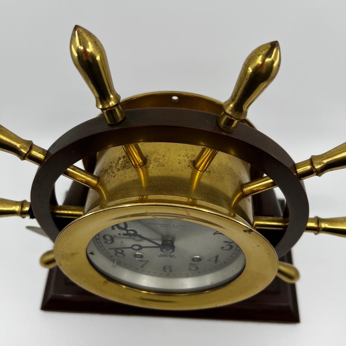 Has been tested and winds but is non operable . Ships Wheel Form. Custom Wooden Stand. Ships Bell has On/Off Switch. Key Wind with 1 Key. Serial #762111. 1950's.