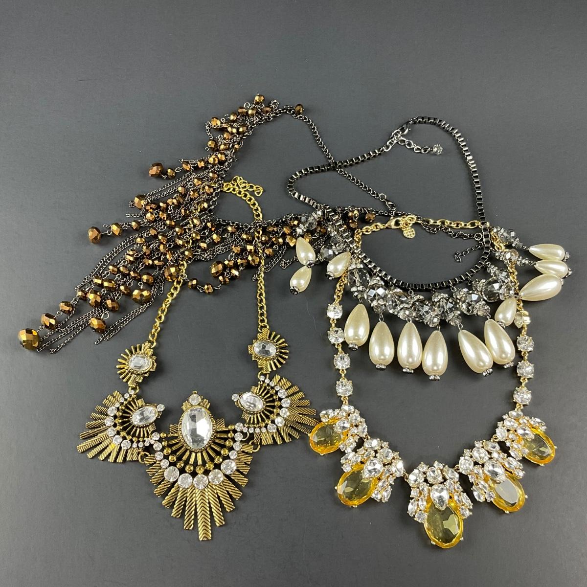 Four miscellaneous costume jewelry beaded and rhinestone necklaces. Please see photos for details and condition. Any condition statement is given as a courtesy to a client, is an opinion, and should not be treated as a statement of fact. Reference to condition written, oral or within a condition report shall not be regarded as a full account of condition and may not include all defects, alterations, or restorations. Absence of a condition report does not imply a lot is flawless or lacking imperfections or damage. Katherine’s Auction & Appraisal Service shall have no responsibility for any error or omission. Returns shall not be accepted on the basis of condition. ::: Shipping is available on this lot. If you require shipping you must let us know at the close of the auction. We will coordinate with you after the item has been won. Shipping fees will include insurance up to or exceeding the value of all items being mailed. If you have any questions regarding this lot please contact the auctioneer either via this website, by direct email or by phone. PICK UP TIMES and other important information can be found in the TERMS and DESCRIPTION of the auction. Please take a look for pertinent information. Thanks!