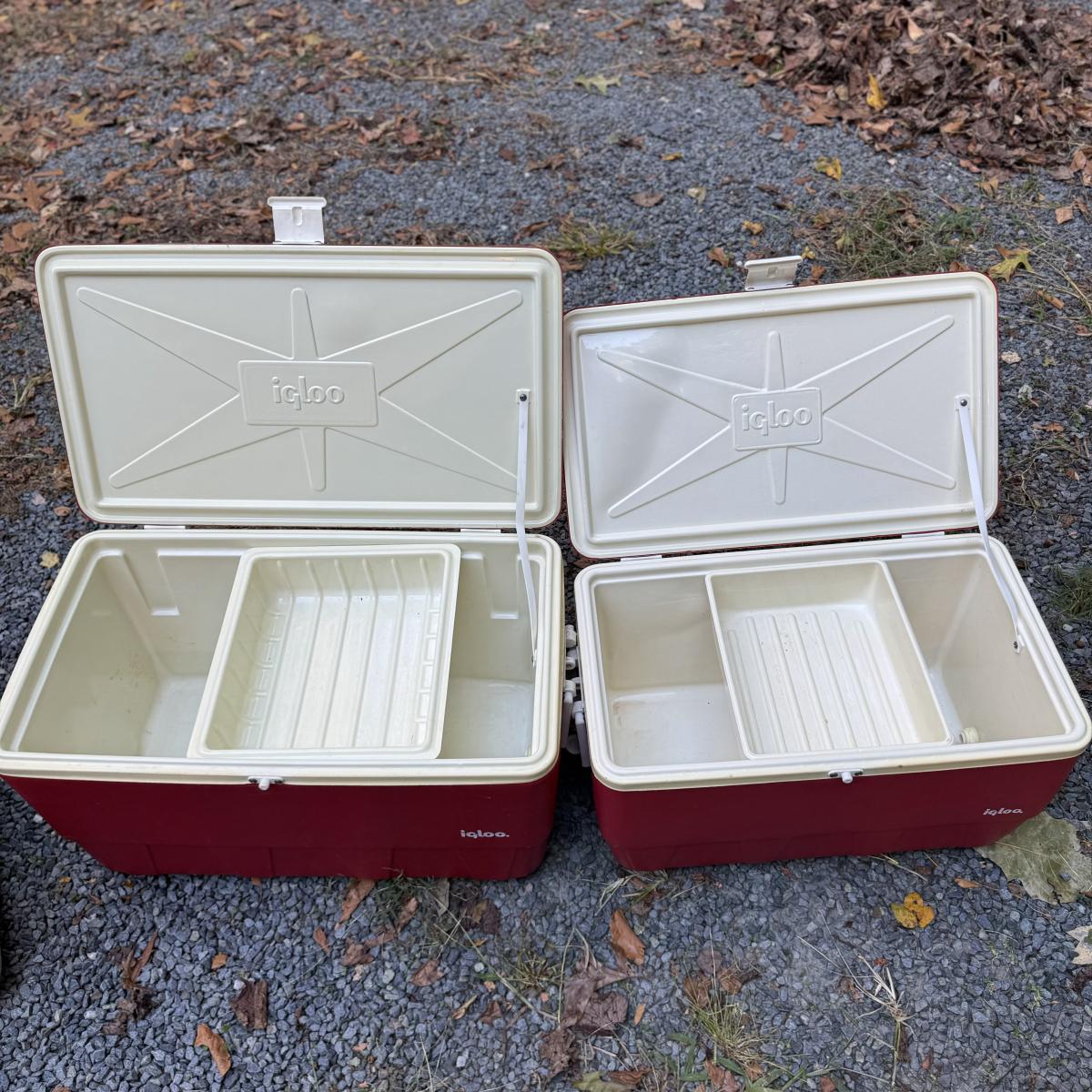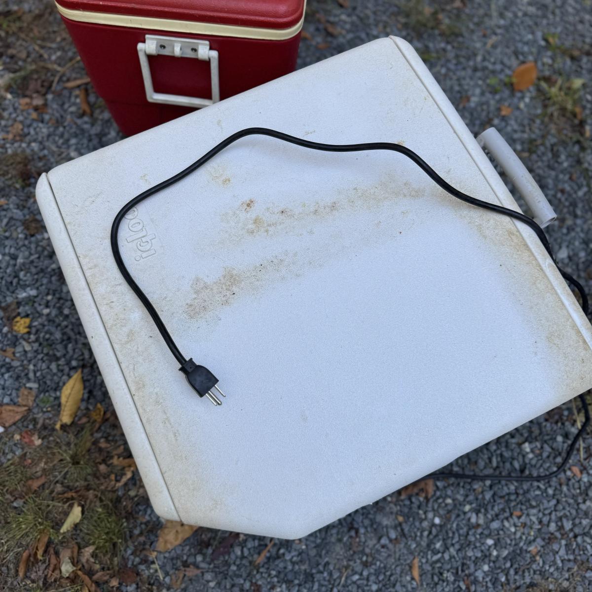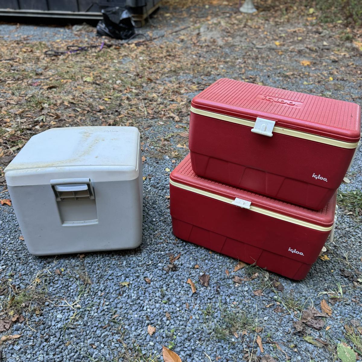 NOTE: Qty (2) are standard red ice chests & qty (1) White plug-in electric ice chest tested and working. All 3 in good shape.