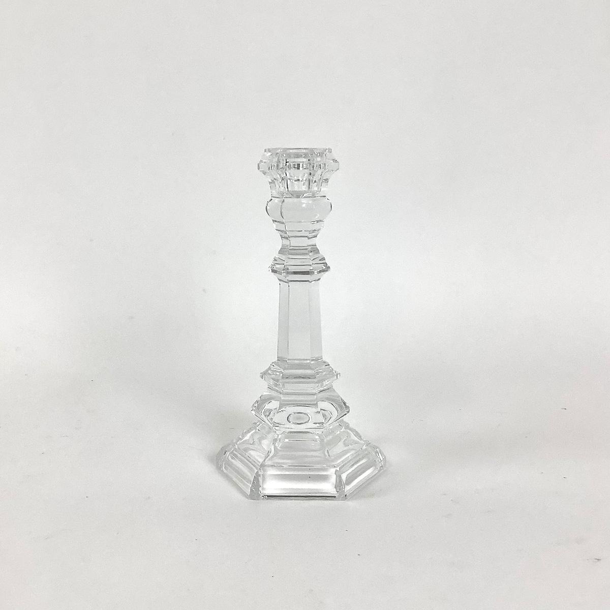 Pair of discontinued heavy cut crystal hexagonal candle holders stamped Tiffany & Co in the Plymouth pattern, 8"H, 3.75"W, 4.25"D.