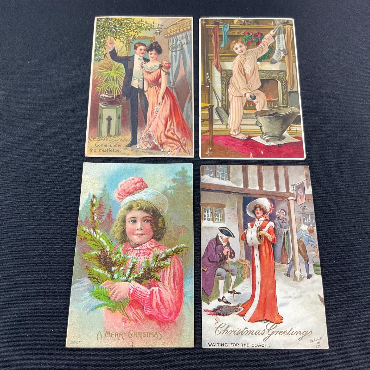 Four assorted Christmas postcards. Please see photos for details and condition. Any condition statement is given as a courtesy to a client, is an opinion, and should not be treated as a statement of fact. Reference to condition written, oral or within a condition report shall not be regarded as a full account of condition and may not include all defects, alterations, or restorations. Absence of a condition report does not imply a lot is flawless or lacking imperfections or damage. Katherine’s Auction & Appraisal Service shall have no responsibility for any error or omission. Returns shall not be accepted on the basis of condition. ::: Shipping is available on this lot. If you require shipping you must let us know at the close of the auction. We will coordinate with you after the item has been won. Shipping fees will include insurance up to or exceeding the value of all items being mailed. If you have any questions regarding this lot please contact the auctioneer either via this website, by direct email or by phone. PICK UP TIMES and other important information can be found in the TERMS and DESCRIPTION of the auction. Please take a look for pertinent information. Thanks!