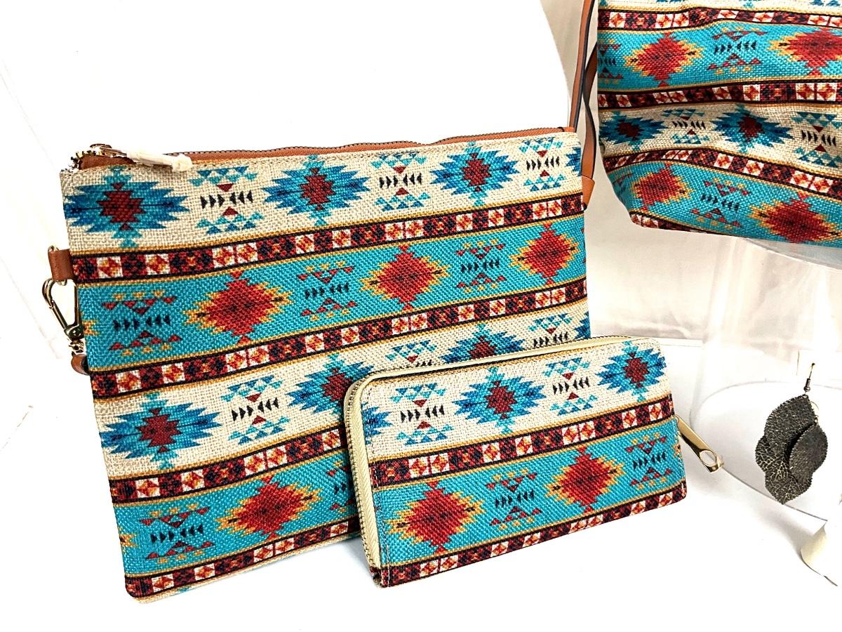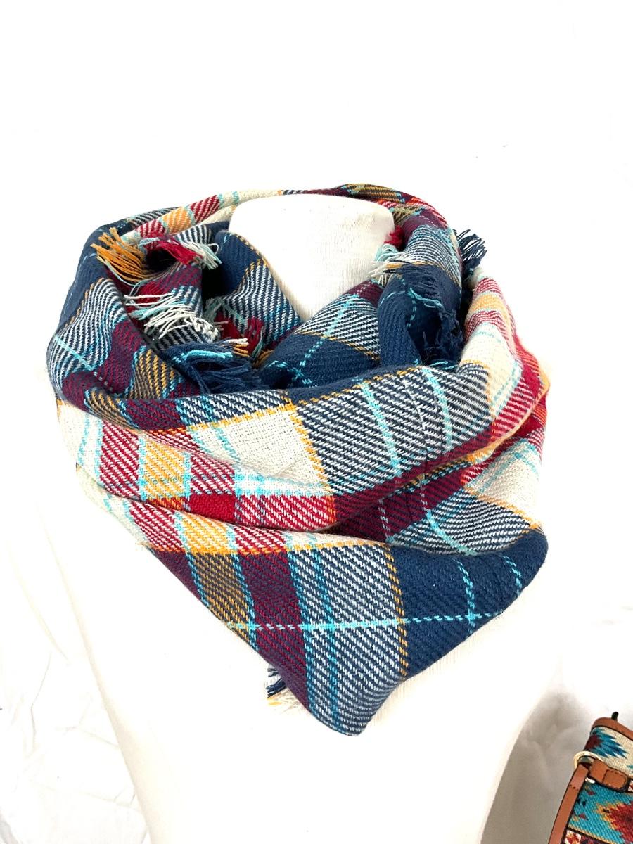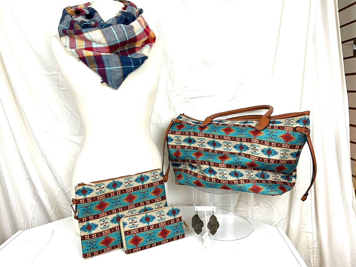 245 Three in One Aztec Style Handbag with Filigree Earrings and Plaid Infinity Scarf