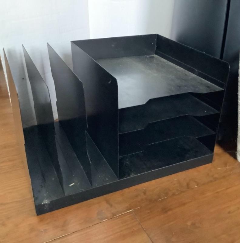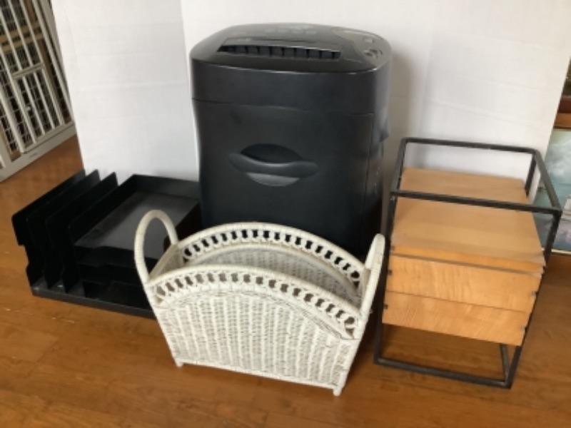 Royal paper shredder, 2 paper organizers- 1 metal and 1 is iron and wood, a wicker basket and a plastic two tier organizer