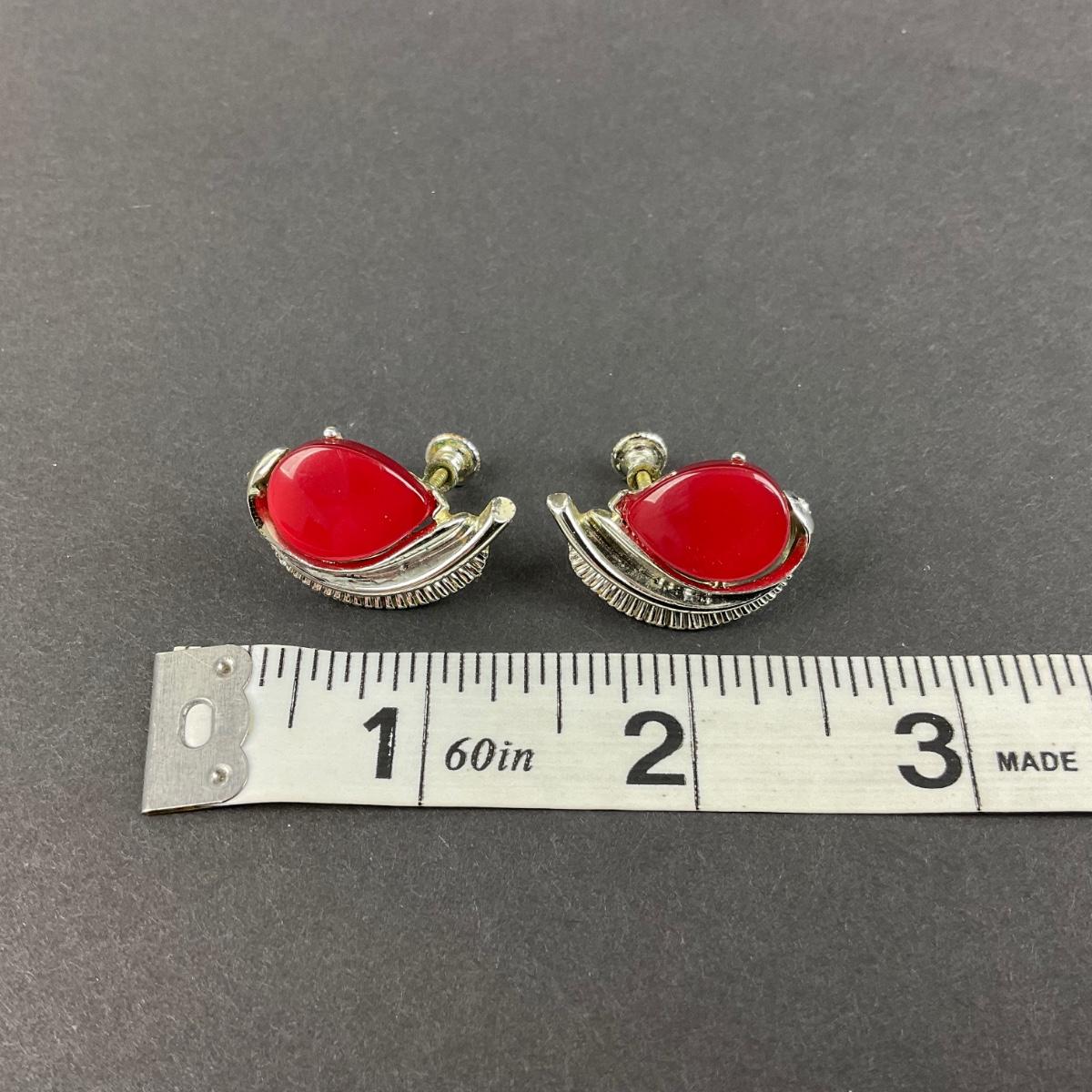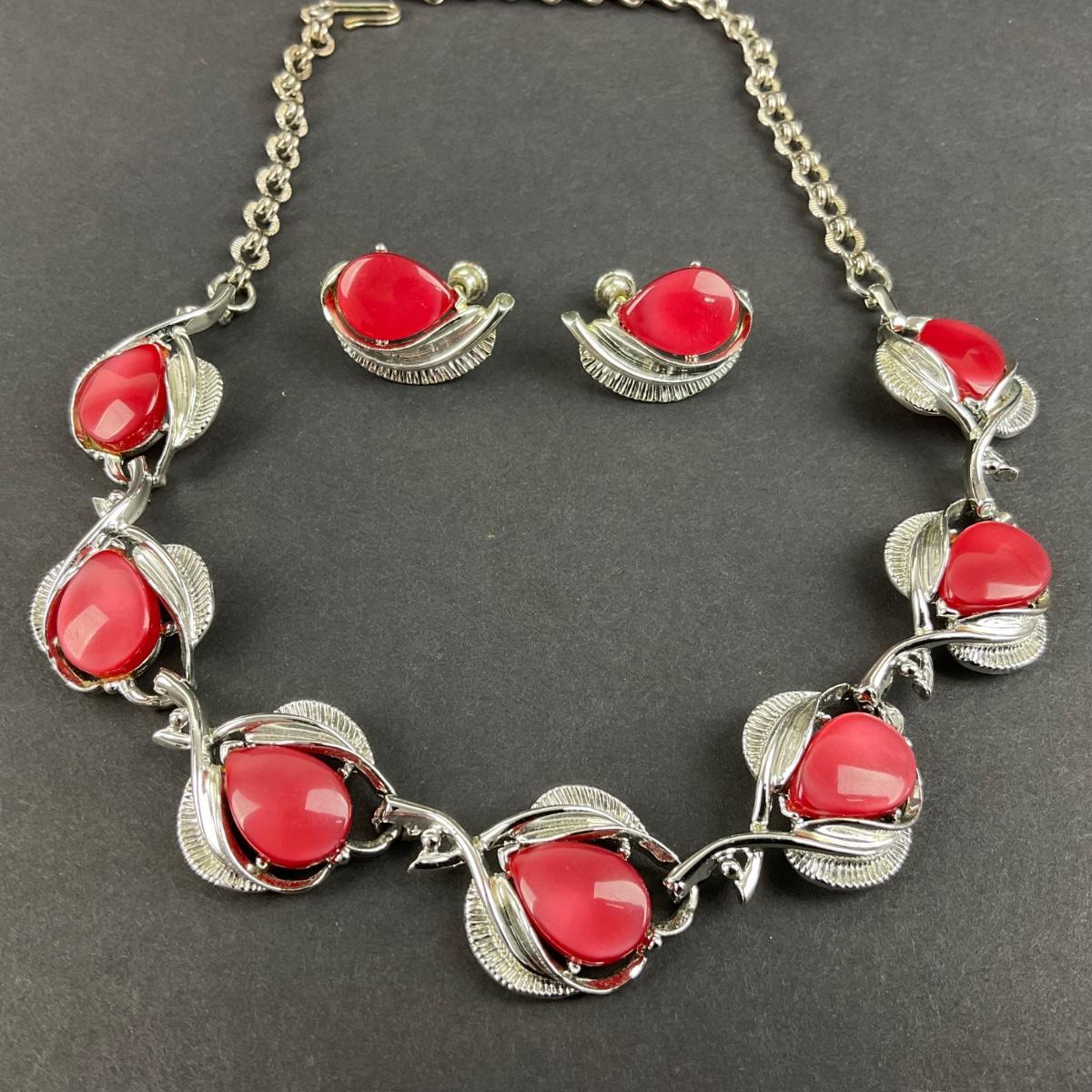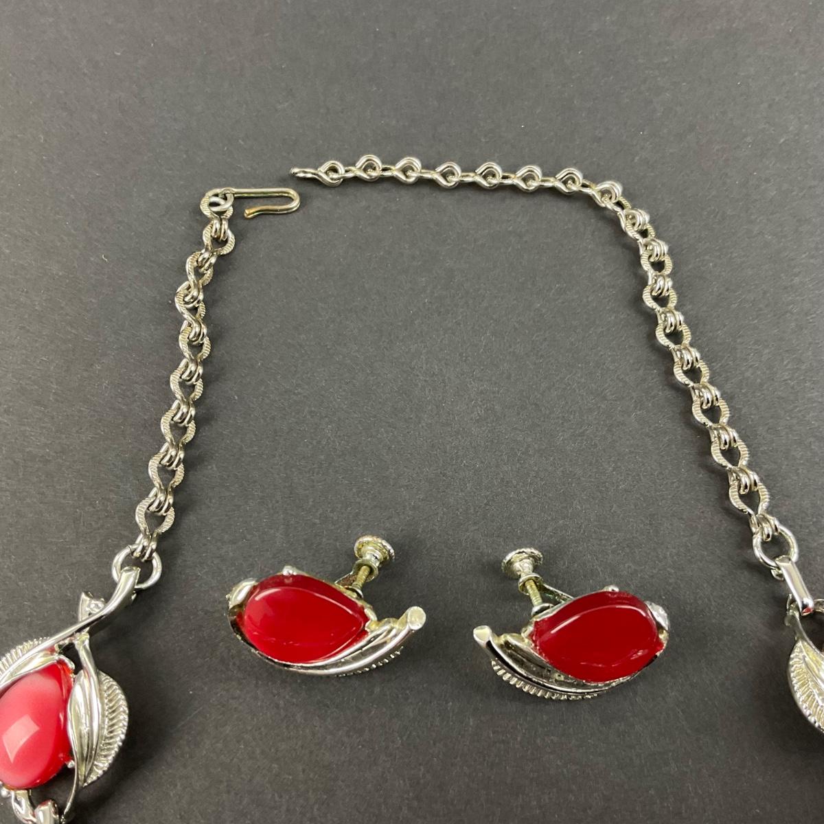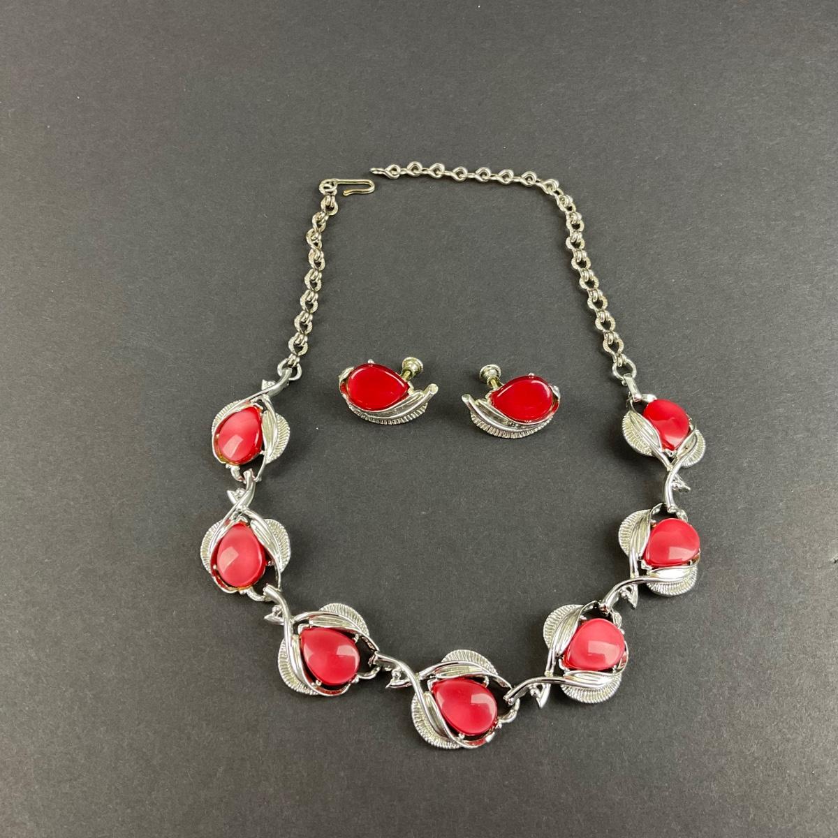 One vintage costume jewelry red necklace and matching earrings set. Please see photos for details and condition. Any condition statement is given as a courtesy to a client, is an opinion, and should not be treated as a statement of fact. Reference to condition written, oral or within a condition report shall not be regarded as a full account of condition and may not include all defects, alterations, or restorations. Absence of a condition report does not imply a lot is flawless or lacking imperfections or damage. Katherine’s Auction & Appraisal Service shall have no responsibility for any error or omission. Returns shall not be accepted on the basis of condition. ::: Shipping is available on this lot. If you require shipping you must let us know at the close of the auction. We will coordinate with you after the item has been won. Shipping fees will include insurance up to or exceeding the value of all items being mailed. If you have any questions regarding this lot please contact the auctioneer either via this website, by direct email or by phone. PICK UP TIMES and other important information can be found in the TERMS and DESCRIPTION of the auction. Please take a look for pertinent information. Thanks!