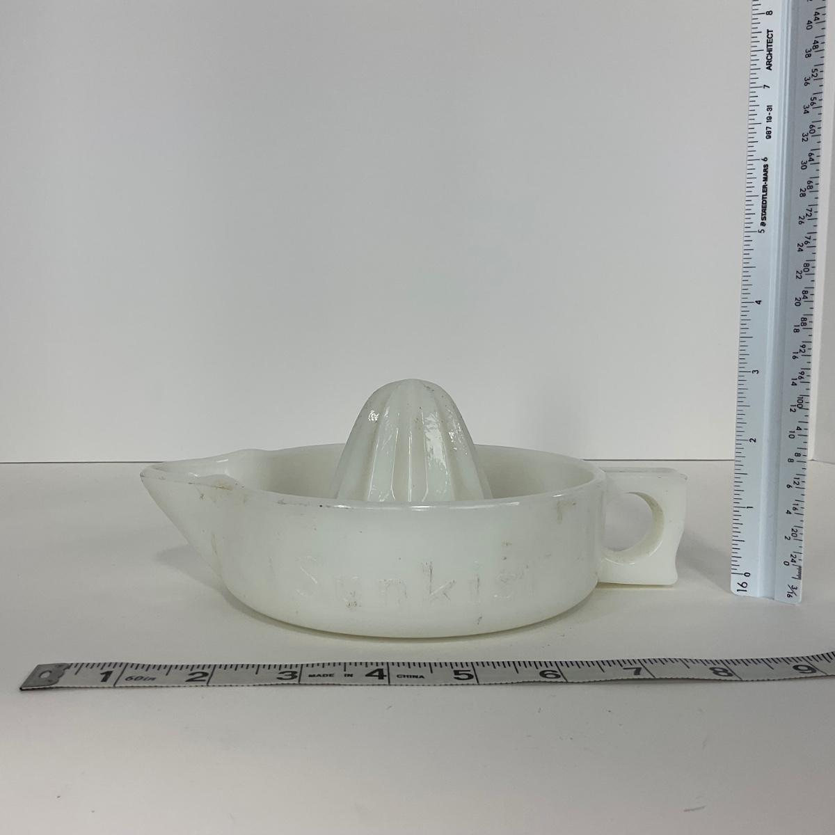 One milk glass Sunkist reamer. Does have some damage. Please see photos for details and condition. ::: Shipping is available on this lot. If you require shipping you must let us know at the close of the auction. We will coordinate with you after the item has been won. Shipping fees will include insurance up to or exceeding the value of all items being mailed. If you have any questions regarding this lot please contact the auctioneer either via this website, by direct email or by phone. PICK UP TIMES and other important information can be found in the TERMS and DESCRIPTION of the auction. Please take a look for pertinent information. Thanks!
