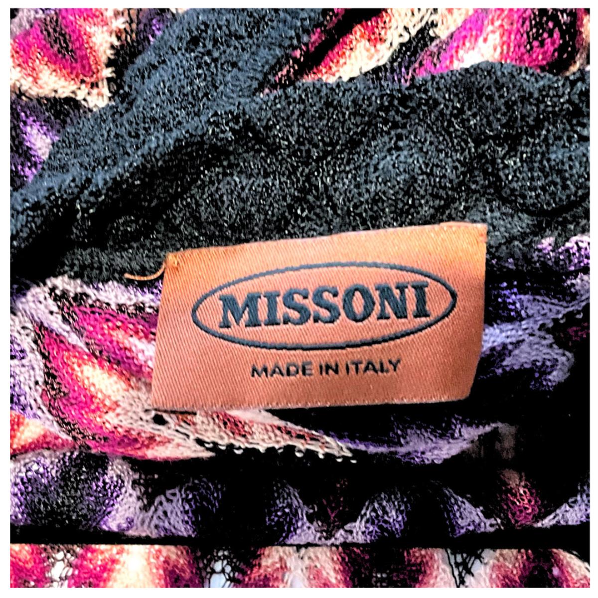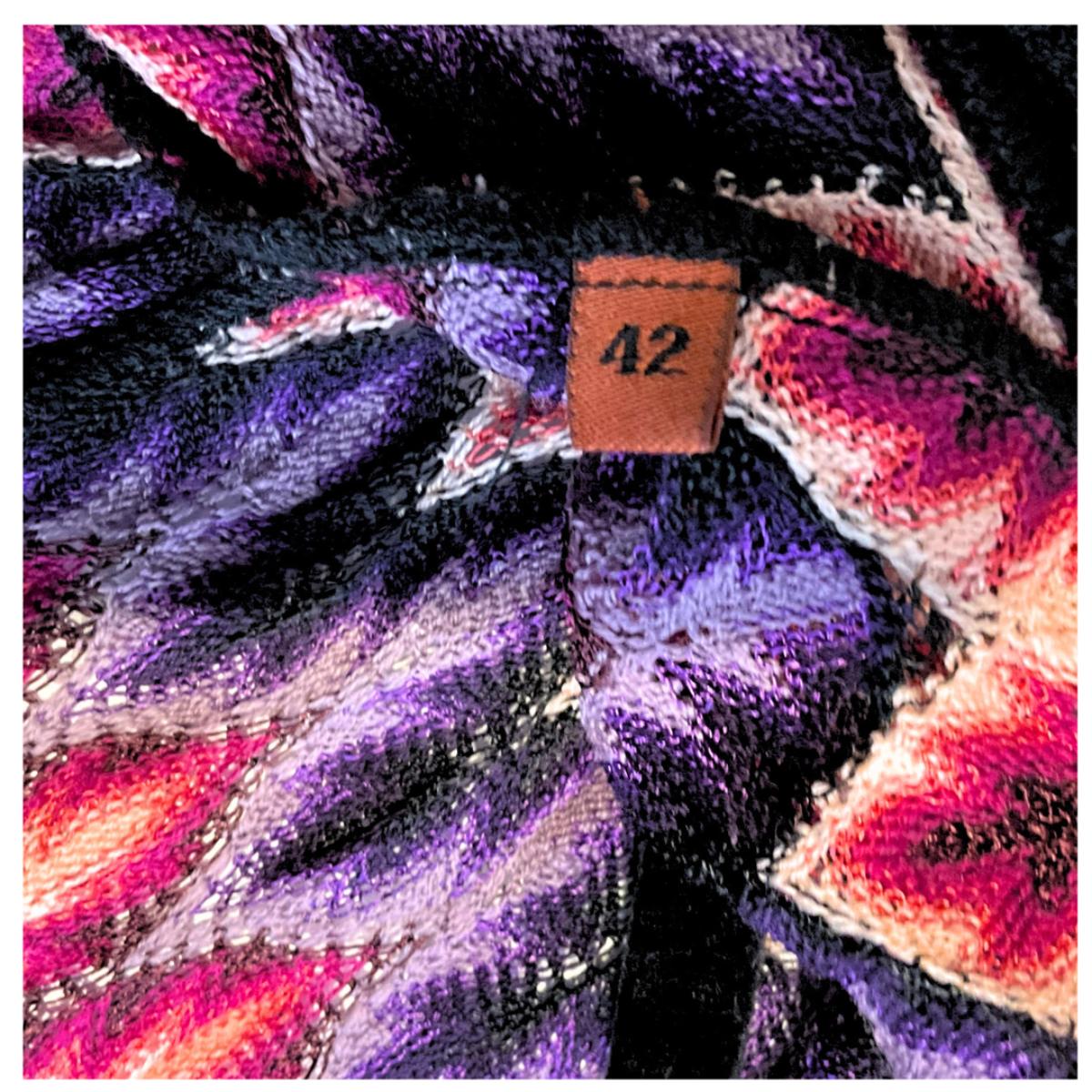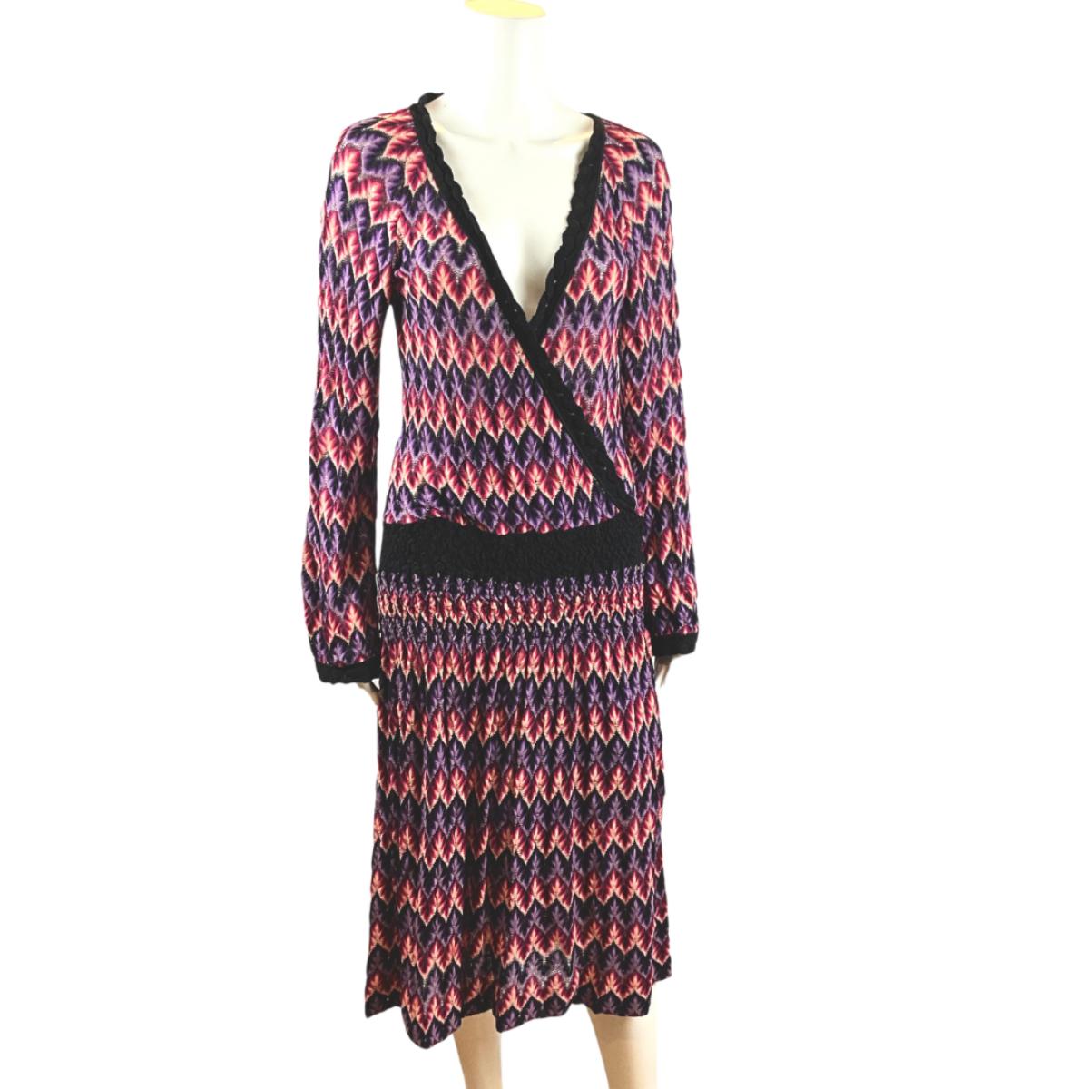 Description: Stunning Missoni multicolor knit dress featuring an eye-catching chevron pattern in shades of purple, pink, and black. Designed with a flattering wrap-around style and textured knit fabric for an effortlessly chic look. Perfect for both casual and formal occasions.