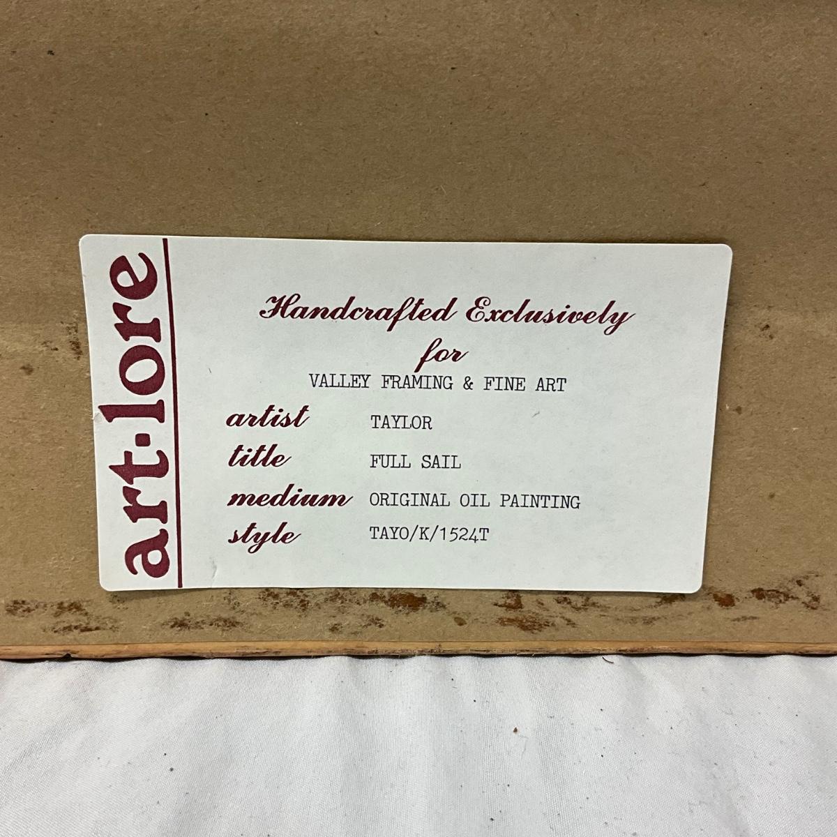 Original oil painting titled Full Sail by the artist Taylor. This hand-painted maritime scene depicts a sailboat under full canvas against a dramatic sky, rendered in a classic nautical style. Professionally framed by Valley Framing & Fine Art. Likely late 20th century decor or studio artwork. An attractive coastal accent piece well-suited for traditional or nautical interiors.