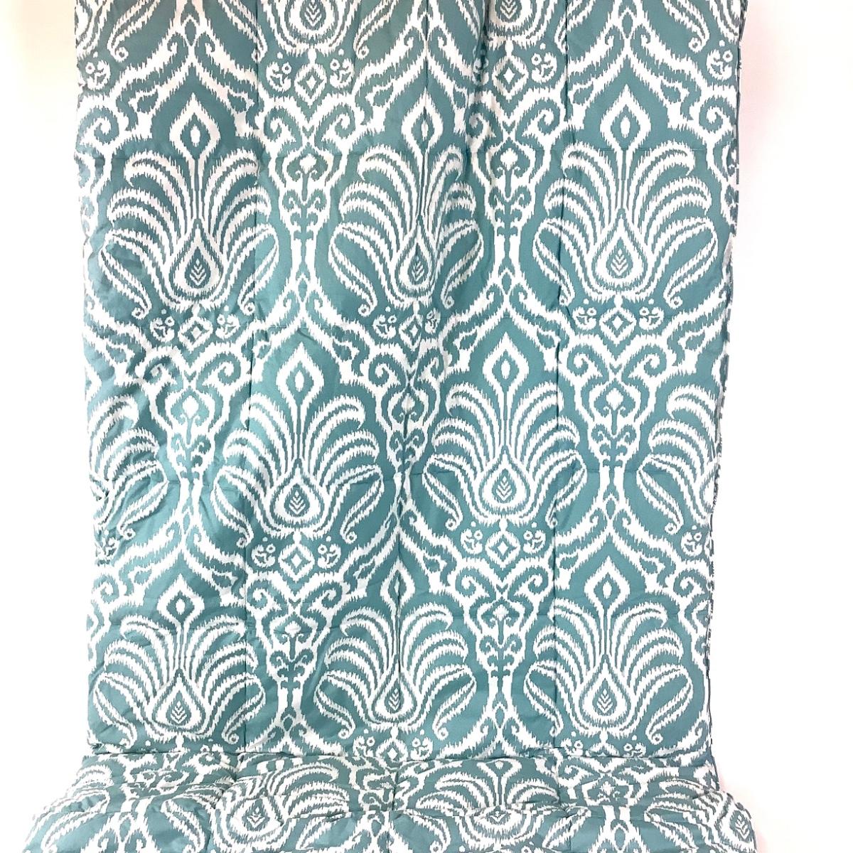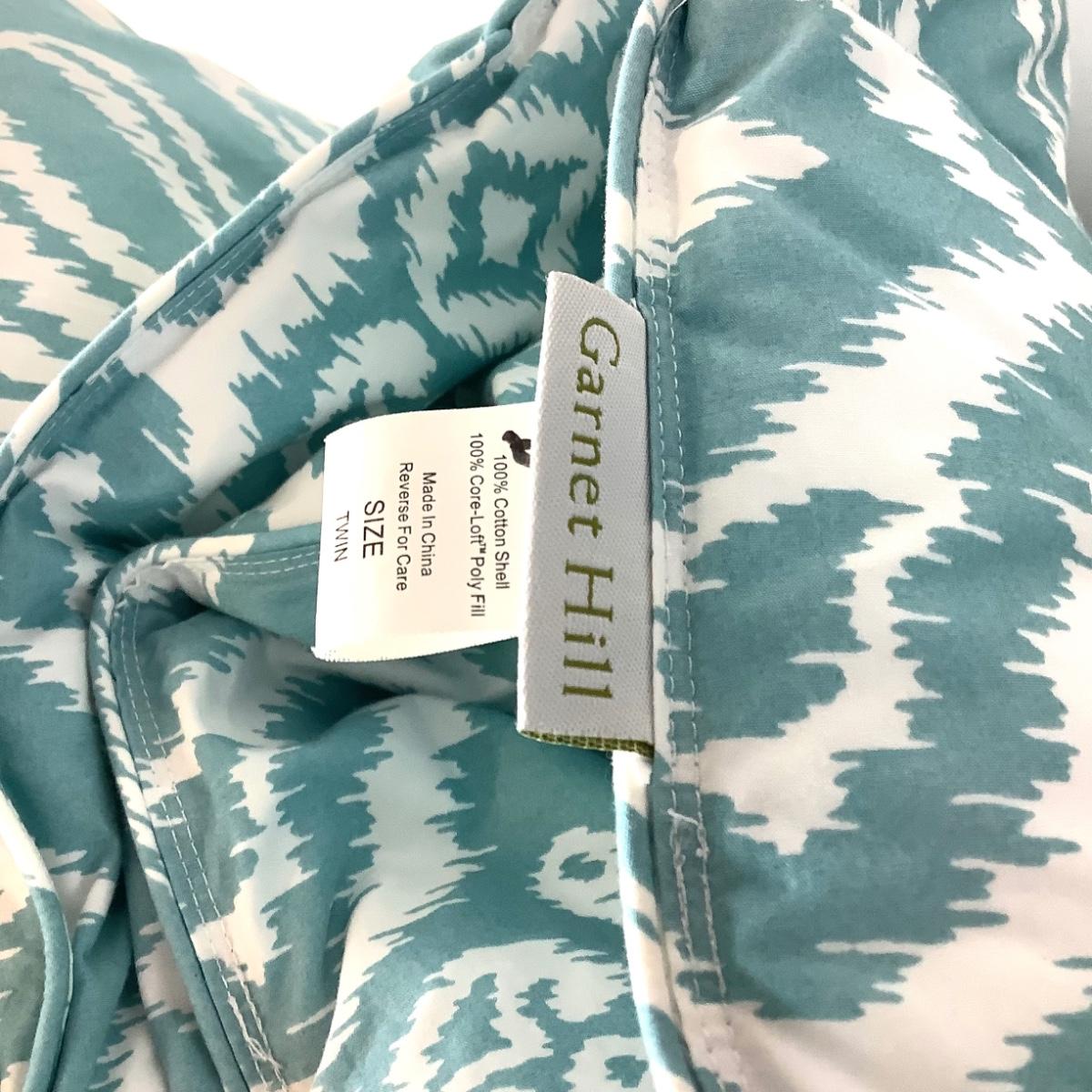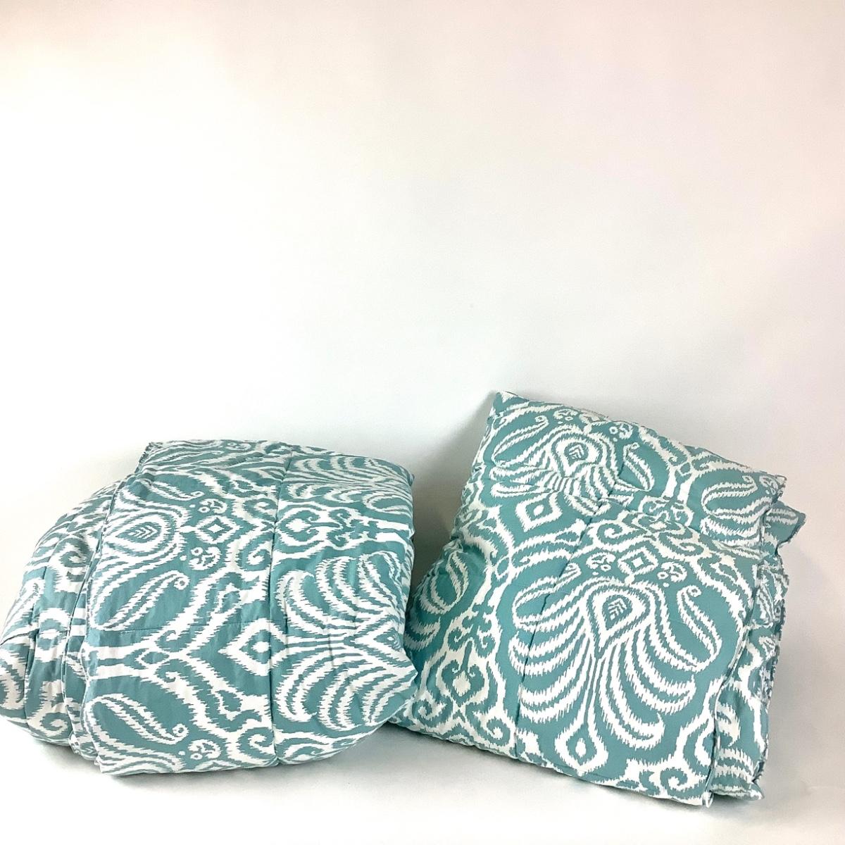 Pair of twin bed size comforters by Garnet Hill, teal and white ikat print, cotton shell, poly fill. Excellent condition.