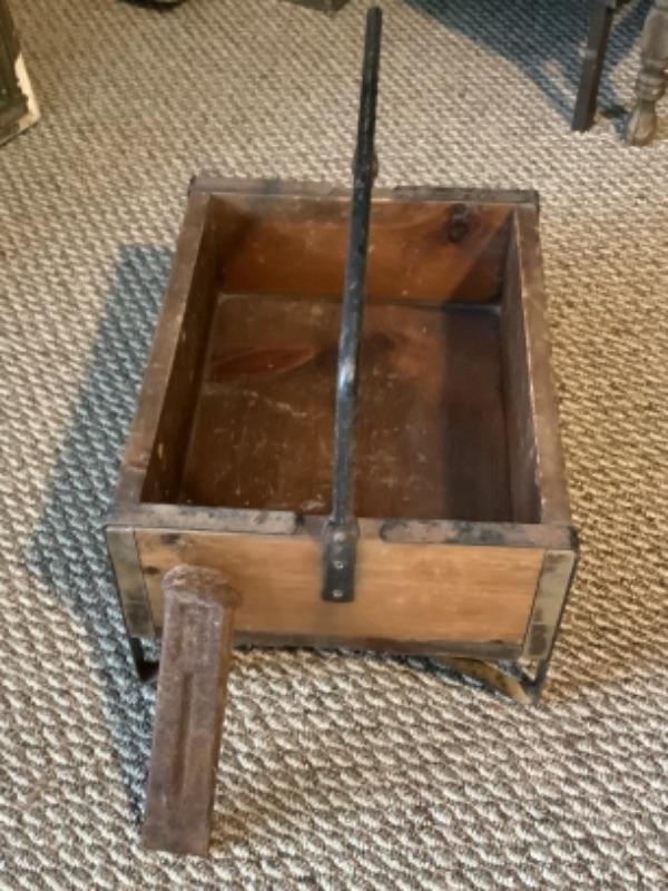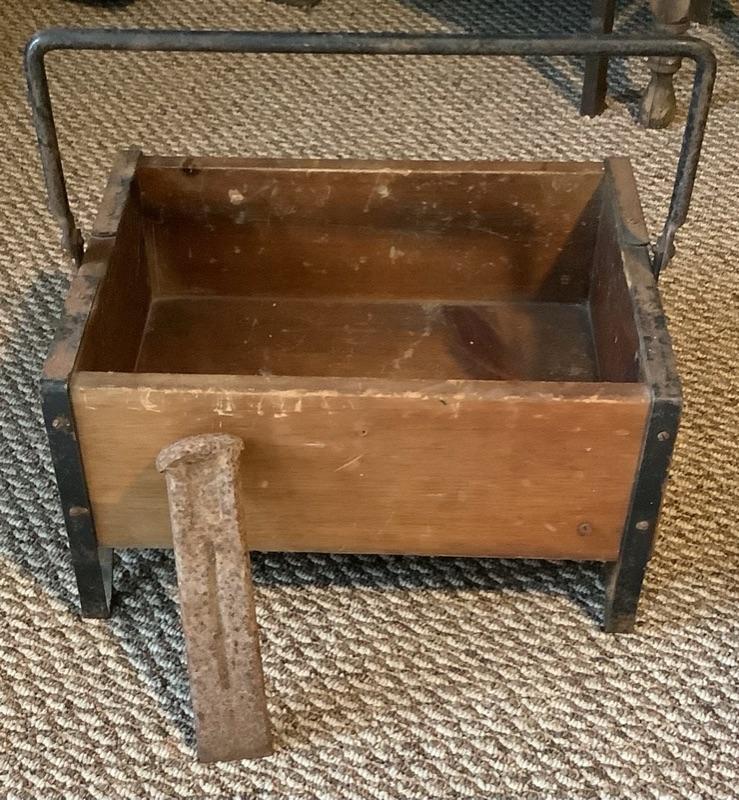 Vintage ferrier box made from wood and iron and a vintage railroad spike
