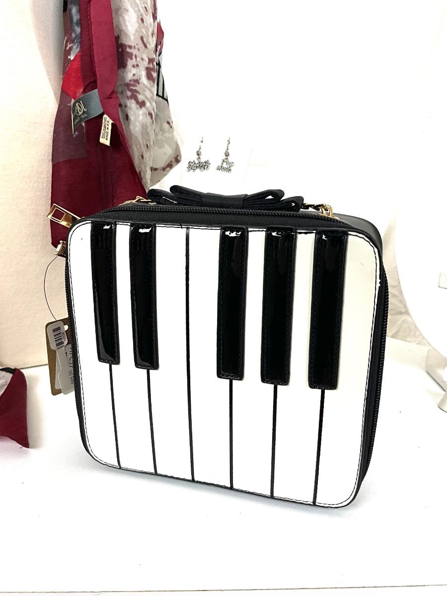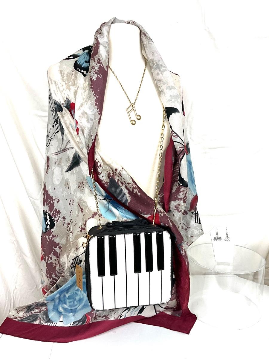 247 Piano Purse with Musical Scarf/Wrap, Music Notes Necklace, I Love Music Earrings