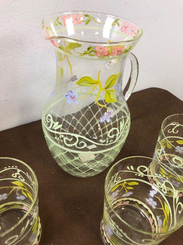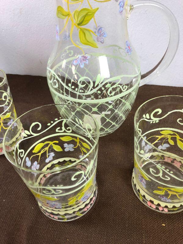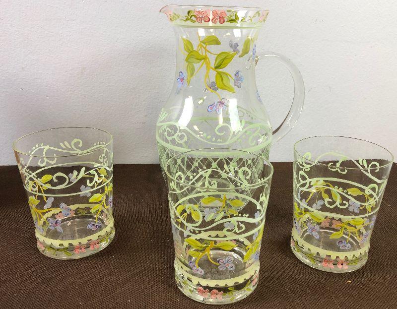#247 Hand Panted Glass Pitcher + 3 Glasses Set