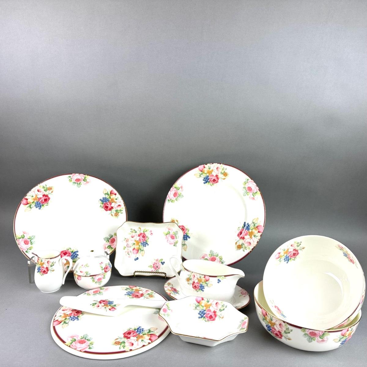 The pattern is "Rosemead" and the lot contains cream, sugar, cake plate, pie server, 2 side bowls, gravy boat with under-plate and more..