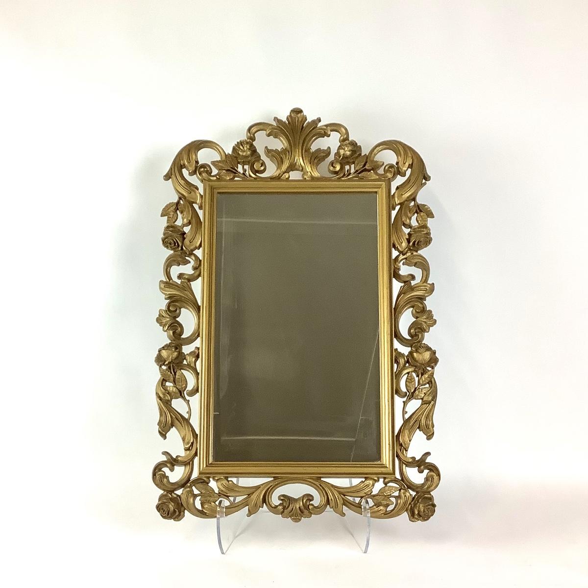 Mid-century, Hollywood Regency, cast resin mirror by Syrocco 1977 with gilded open scroll frame. Very good vintage condition with minor age wear. Measures 29.75"H, 19.5"W, 1.5"D.