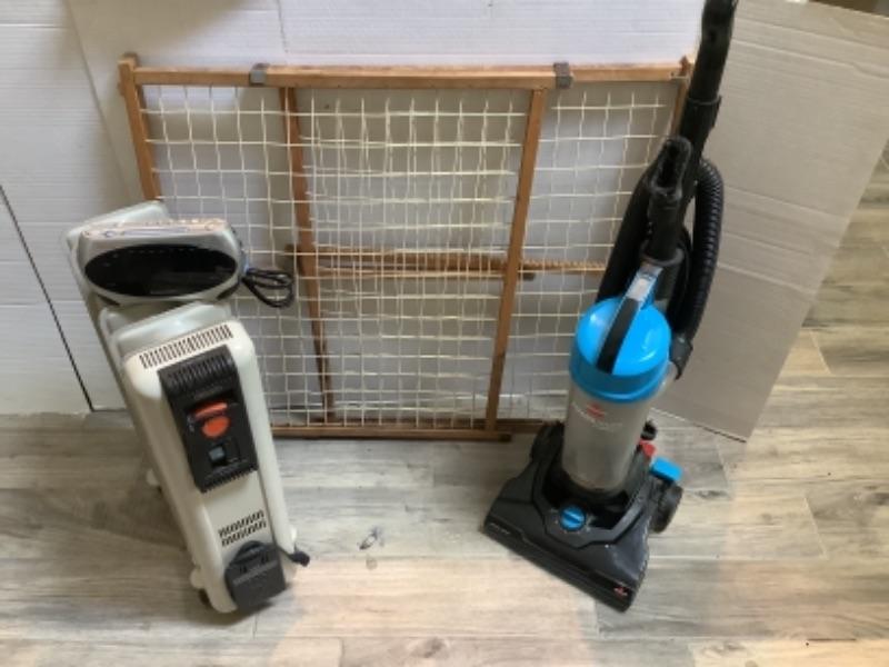 His sell Power Swift Compact vacuum model 16197101E, Emerson Research Smart Set clock radio model CKS1682, DeLonghi electric radiator heater type 3107 and wood baby gate