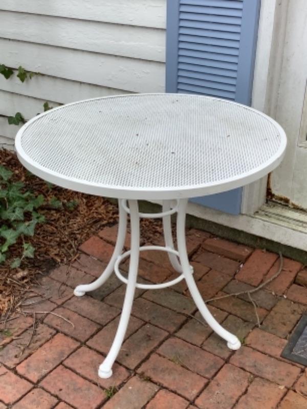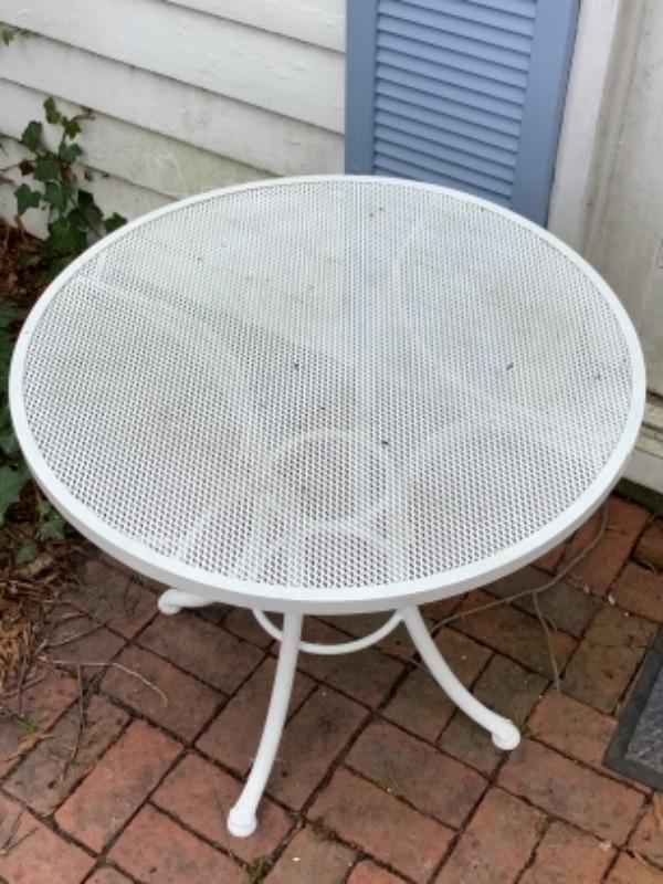 White metal outdoor table measures 30” round and 26-1/2” high