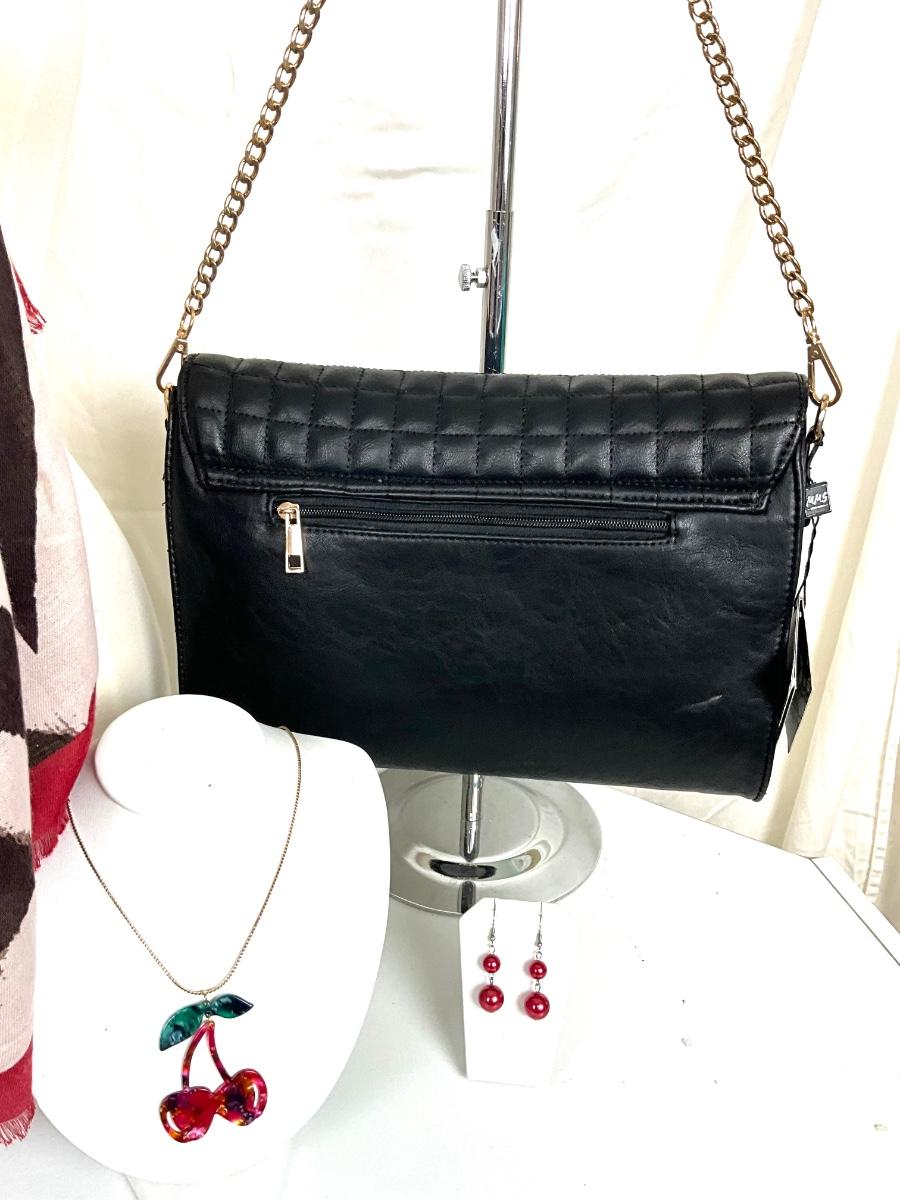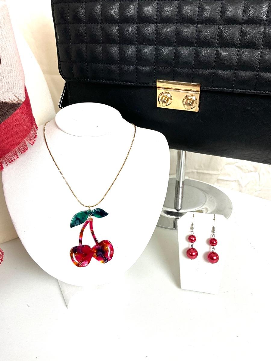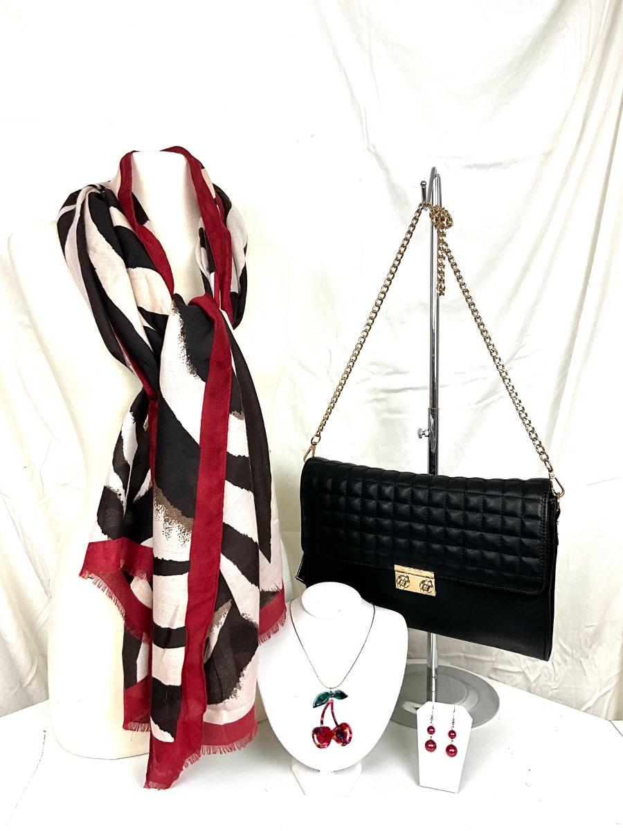 248 Black And Gold Quilted Purse, Animal Print Scarf, Cherry Necklace, Red Beaded Earrings