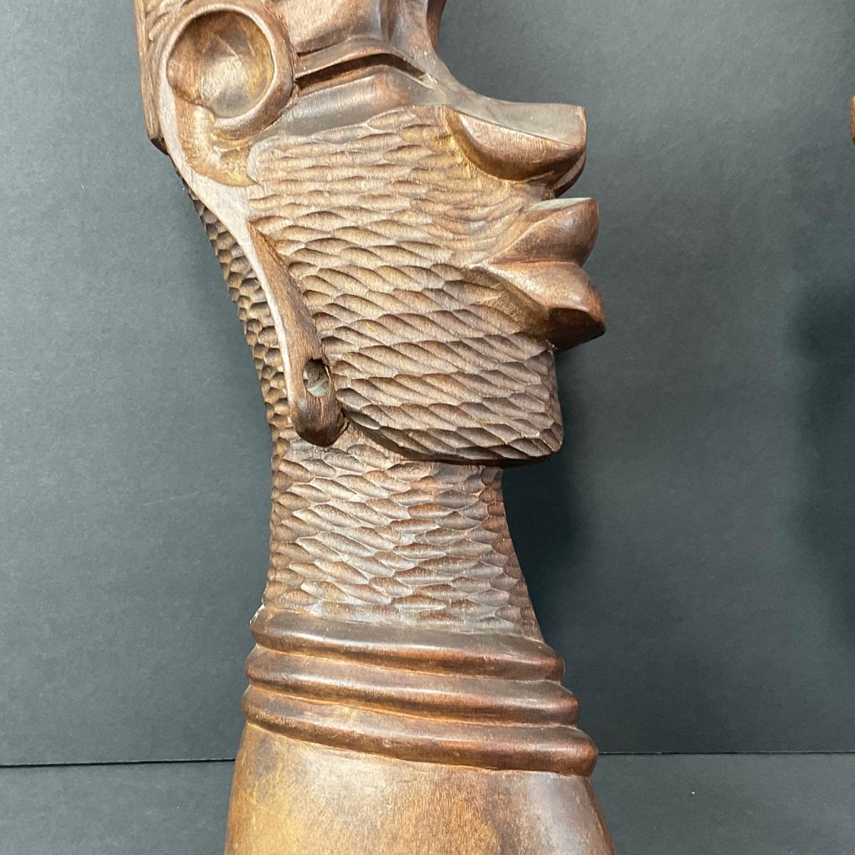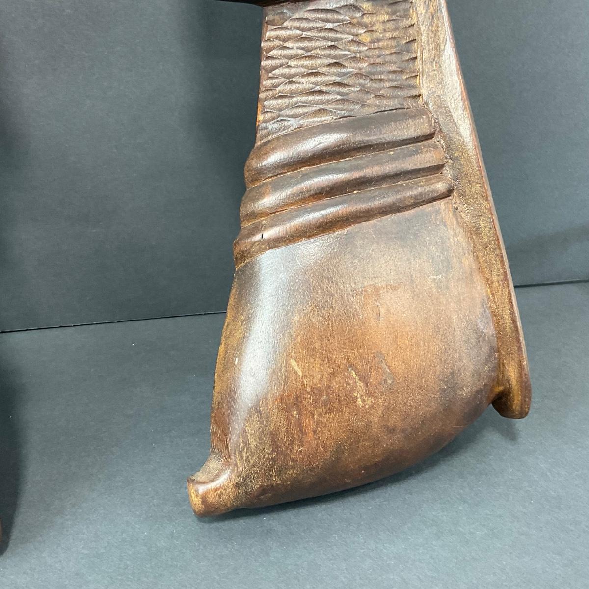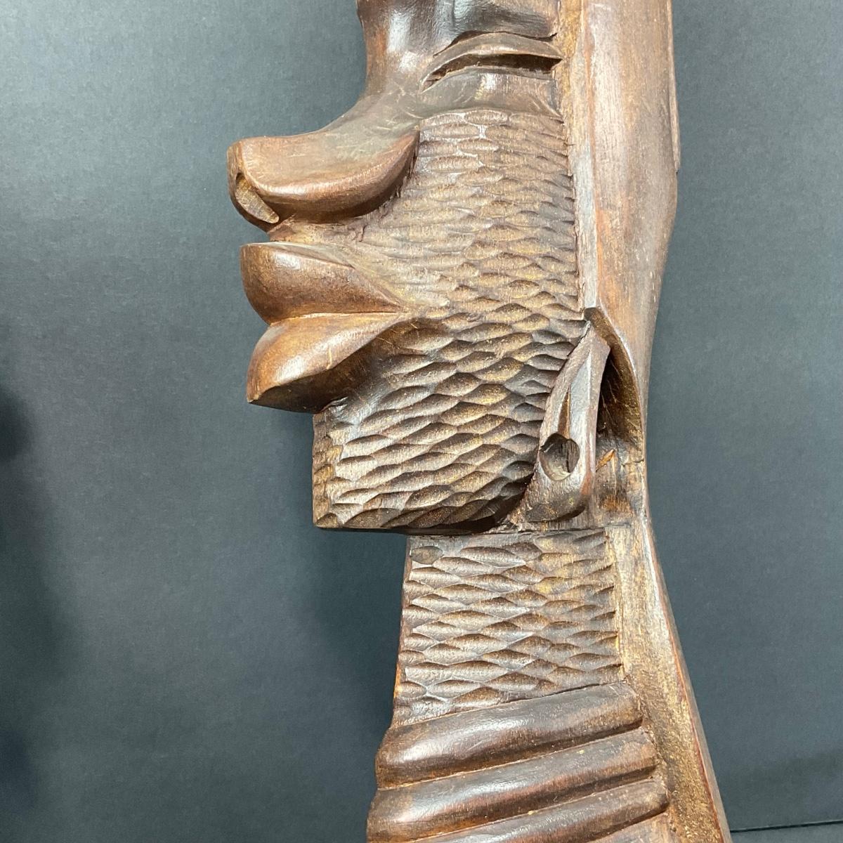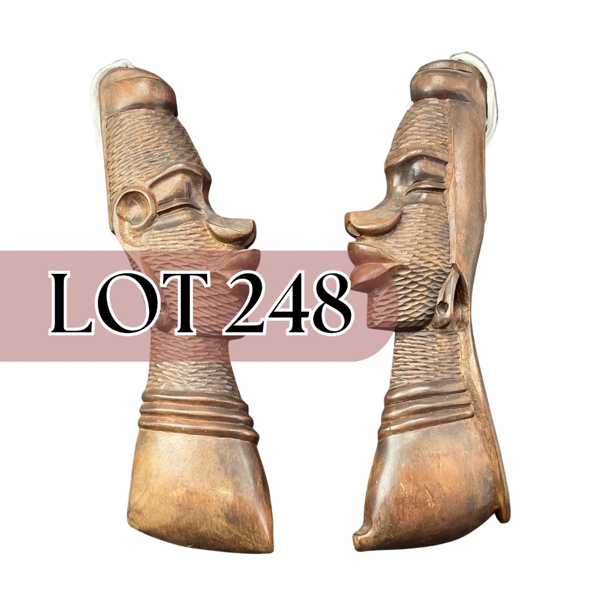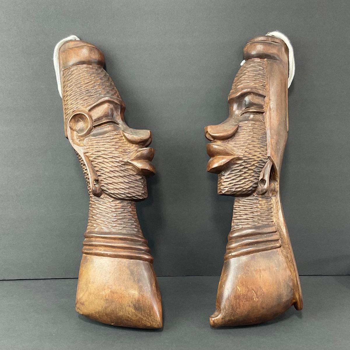 Two very unique collectible believed to be African Tribal masks both pieces are 18 inches long by 5.5 inches wide. Please see photos for details and condition. Any condition statement is given as a courtesy to a client, is an opinion, and should not be treated as a statement of fact. Reference to condition written, oral or within a condition report shall not be regarded as a full account of condition and may not include all defects, alterations, or restorations. Absence of a condition report does not imply a lot is flawless or lacking imperfections or damage. Katherine’s Auction & Appraisal Service shall have no responsibility for any error or omission. Returns shall not be accepted on the basis of condition. ::: Shipping is available on this lot. If you require shipping you must let us know at the close of the auction. We will coordinate with you after the item has been won. Shipping fees will include insurance up to or exceeding the value of all items being mailed. If you have any questions regarding this lot please contact the auctioneer either via this website, by direct email or by phone. PICK UP TIMES and other important information can be found in the TERMS and DESCRIPTION of the auction. Please take a look for pertinent information. Thanks!